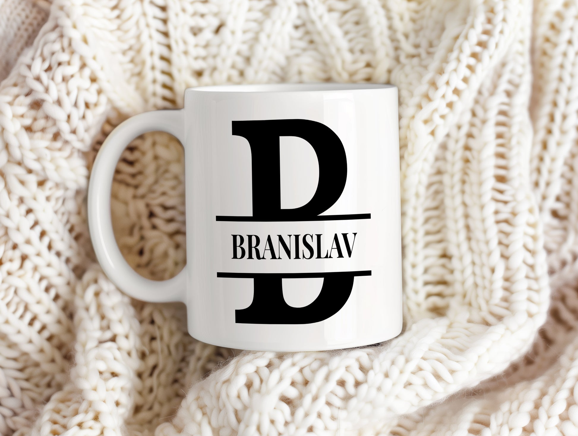 Stylový černobílý hrnek s iniciálou a jménem Branislav v jednoduchém moderním designu. Elegantní osobní dárek pro muže.