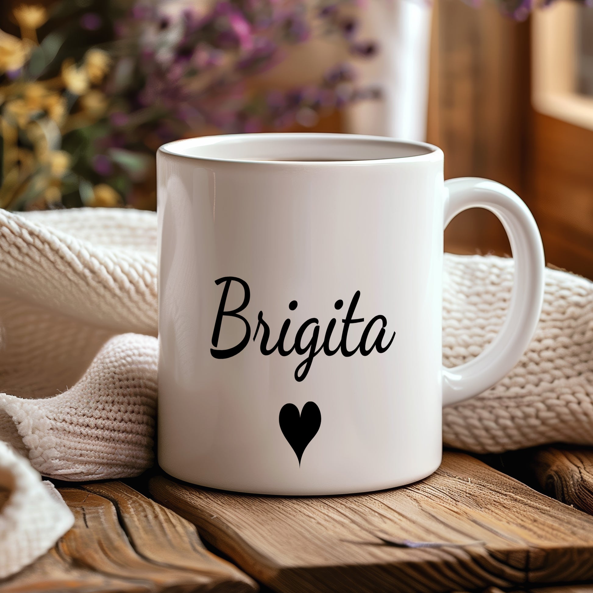 Romantický hrnek se jménem Brigita doplněný decentním symbolem ♥. Krásný dárek k Valentýnu i jen tak pro radost.