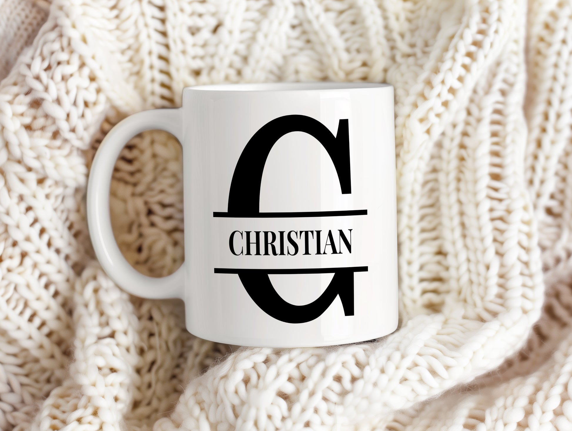Stylový černobílý hrnek s iniciálou a jménem CHRISTIAN v jednoduchém moderním designu. Elegantní osobní dárek pro muže.