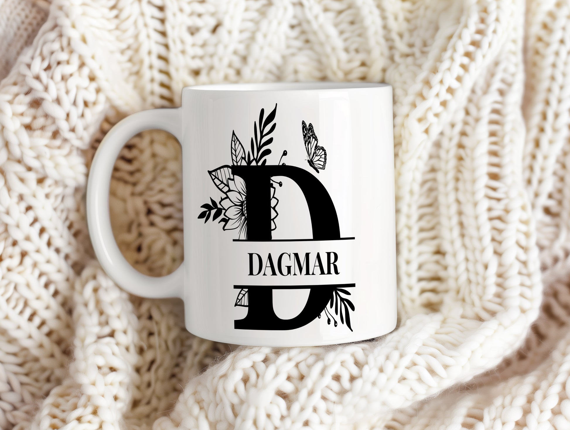 Elegantní hrnek se jménem Dagmar s monogramem zdobeným jemnými květinami. Skvělý osobní dárek pro ženy.