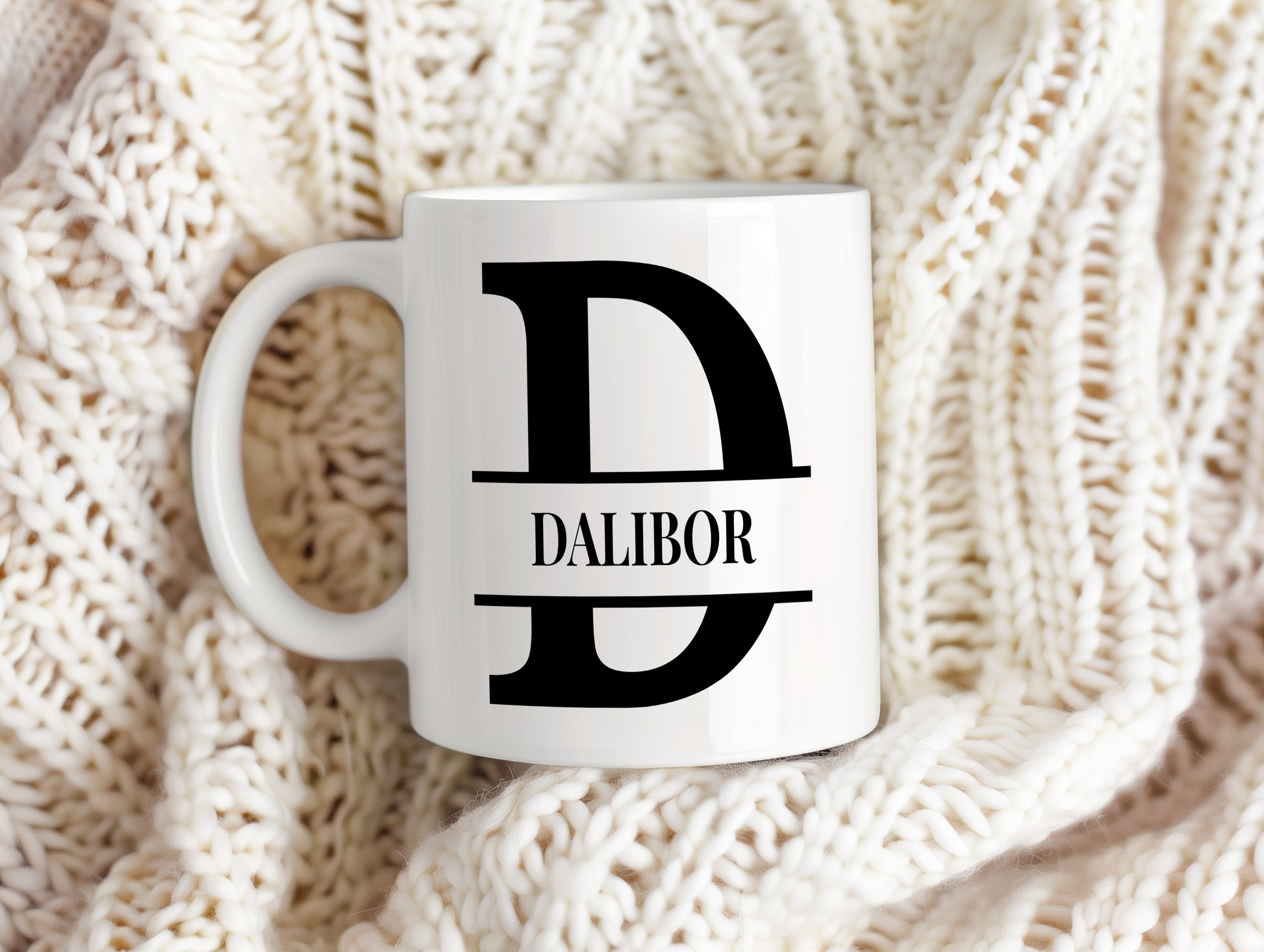 Stylový černobílý hrnek s iniciálou a jménem Dalibor v jednoduchém moderním designu. Elegantní osobní dárek pro muže.