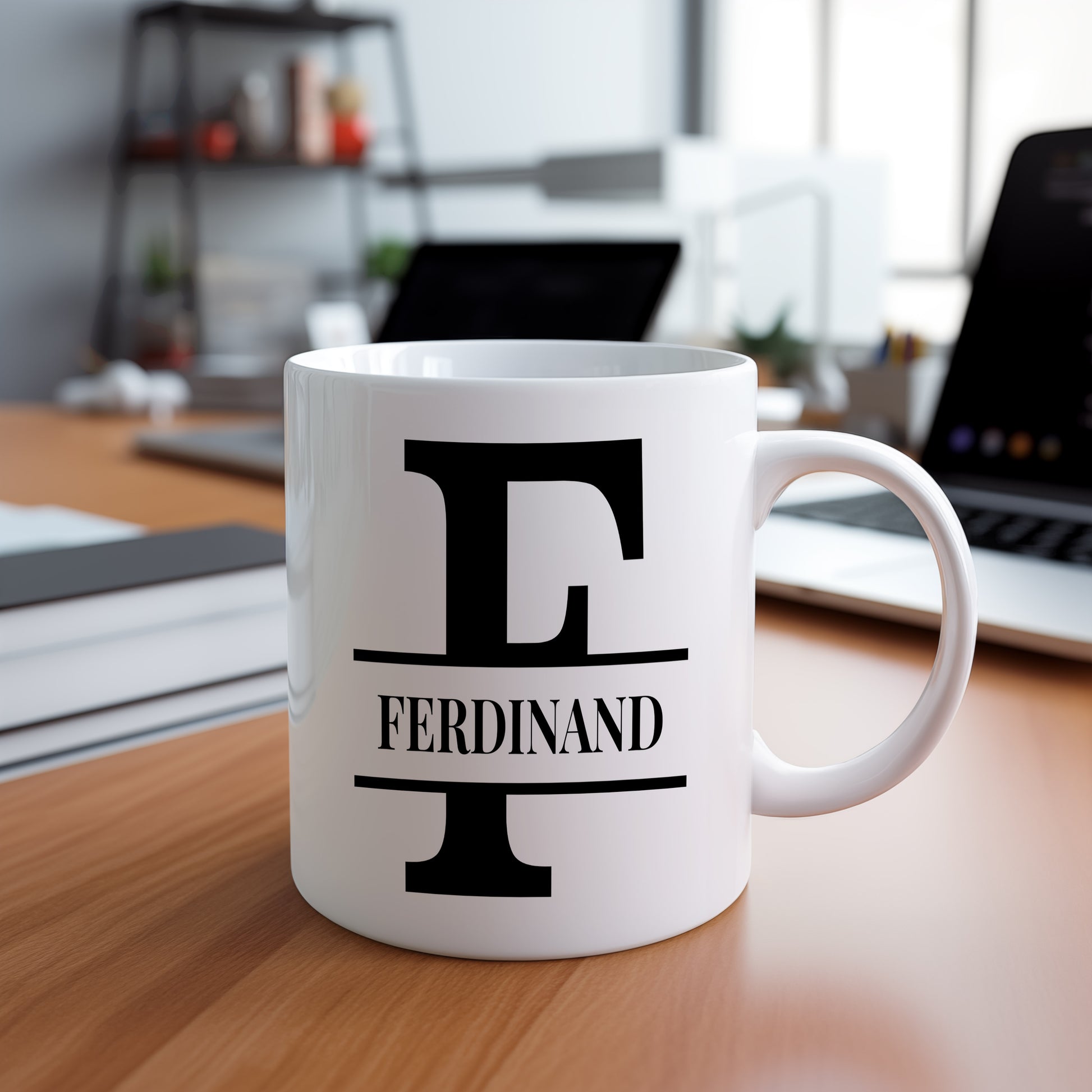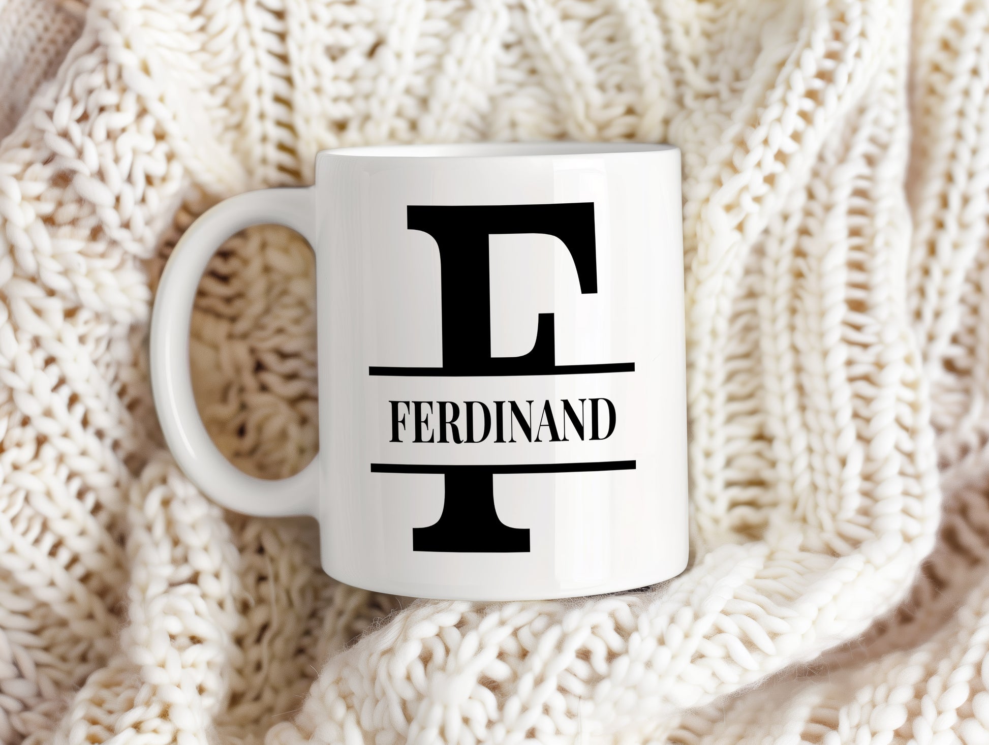 Stylový černobílý hrnek s iniciálou a jménem Ferdinand v jednoduchém moderním designu. Elegantní osobní dárek pro muže.