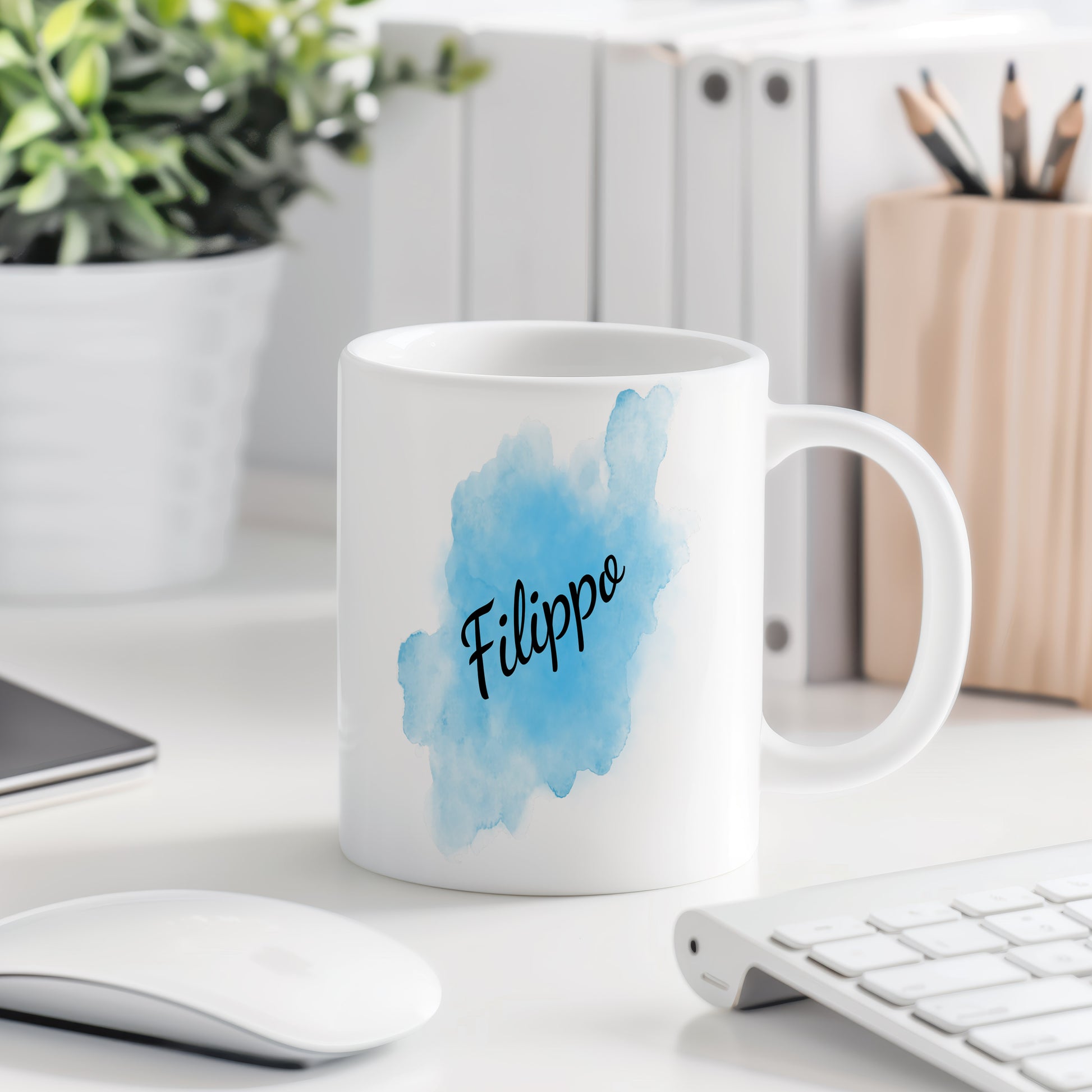 Originální hrnek se jménem Filippo s modrým akvarelovým podkladem. Svěží design pro každý den.