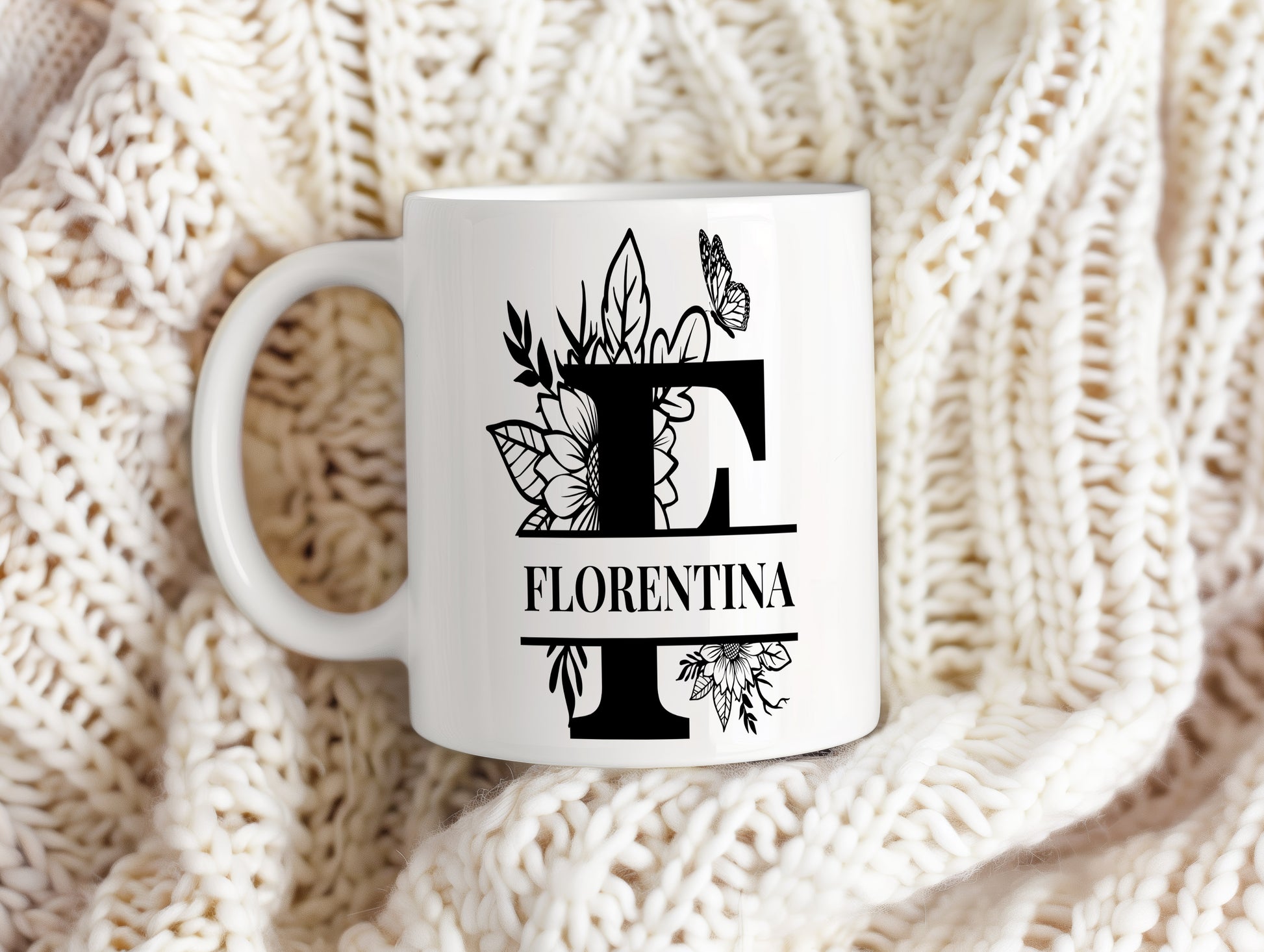 Elegantní hrnek se jménem Florentina s monogramem zdobeným jemnými květinami. Skvělý osobní dárek pro ženy.
