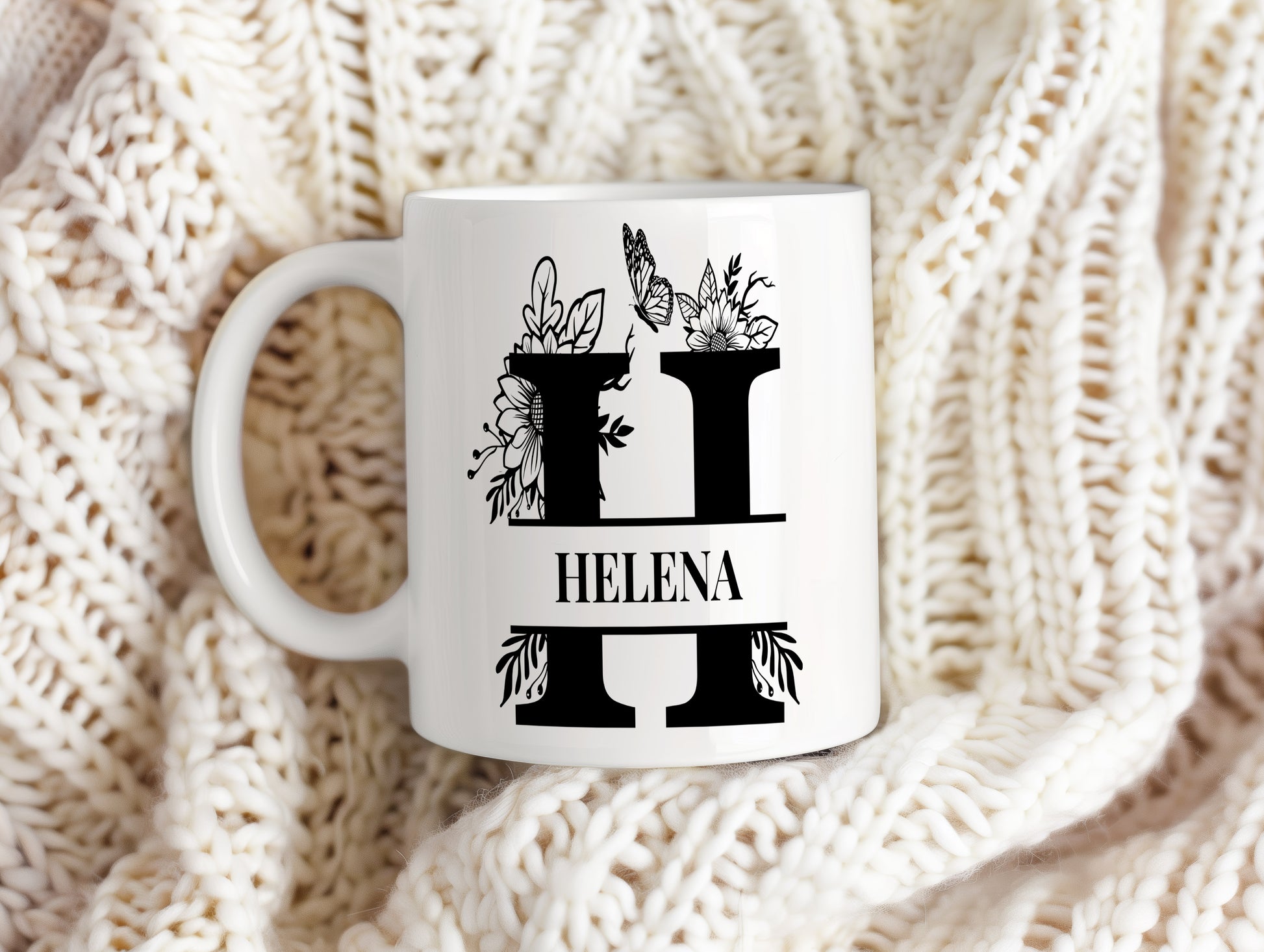 Elegantní hrnek se jménem Helena s monogramem zdobeným jemnými květinami. Skvělý osobní dárek pro ženy.