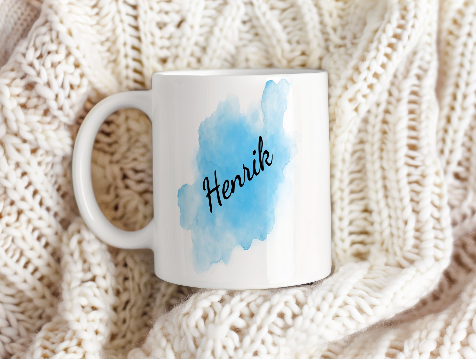 Originální hrnek se jménem Henrik s modrým akvarelovým podkladem. Svěží design pro každý den.