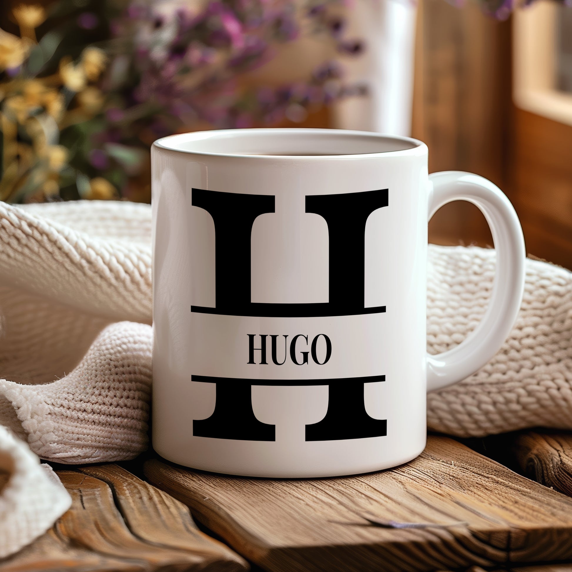 Stylový černobílý hrnek s iniciálou a jménem Hugo v jednoduchém moderním designu. Elegantní osobní dárek pro muže.