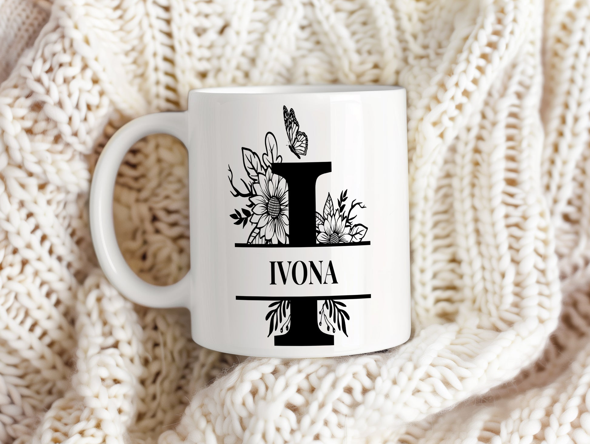 Elegantní hrnek se jménem Ivona s monogramem zdobeným jemnými květinami. Skvělý osobní dárek pro ženy.