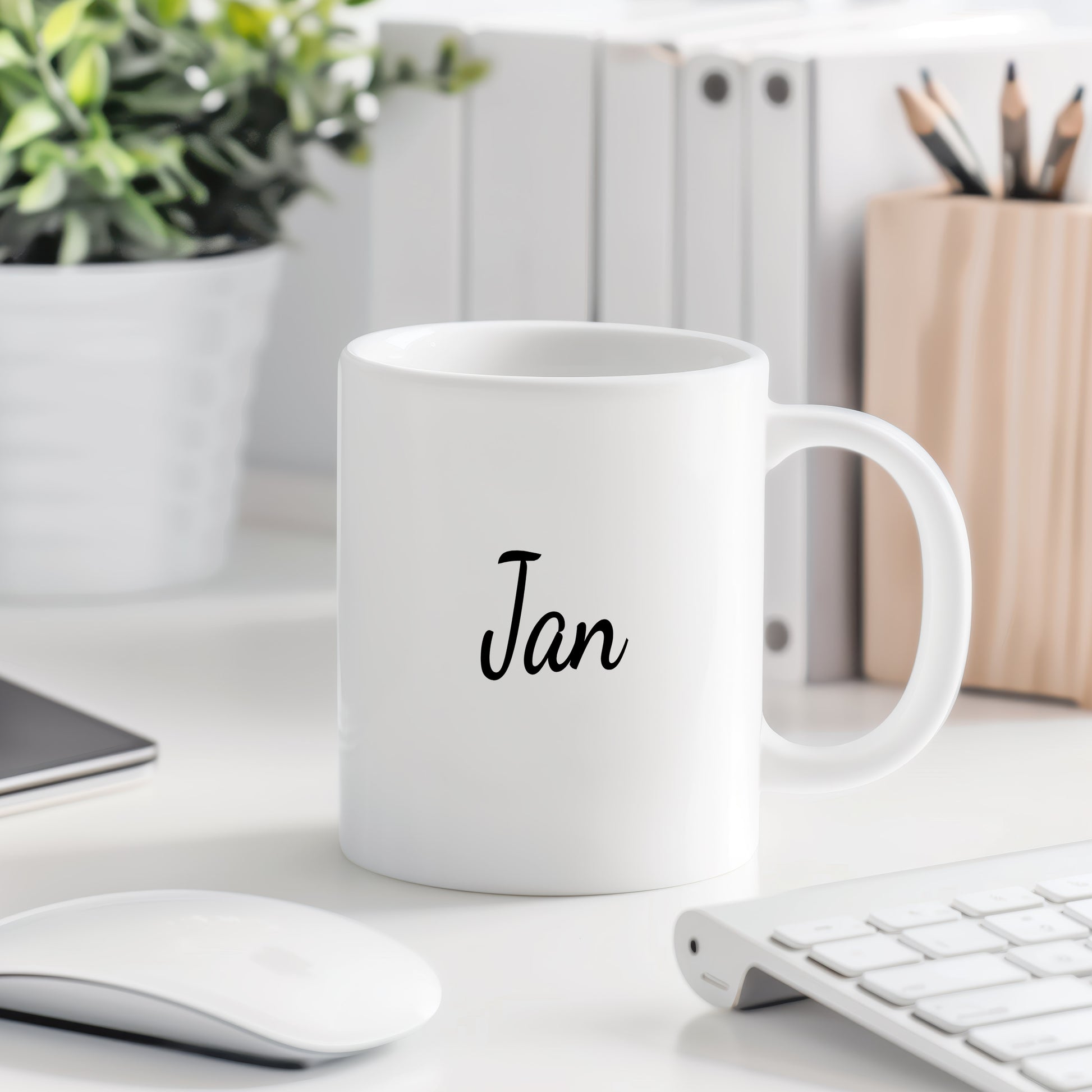 Jednoduchý bílý hrnek se jménem Jan v čistém moderním fontu. Praktický dárek do kanceláře i domů.
