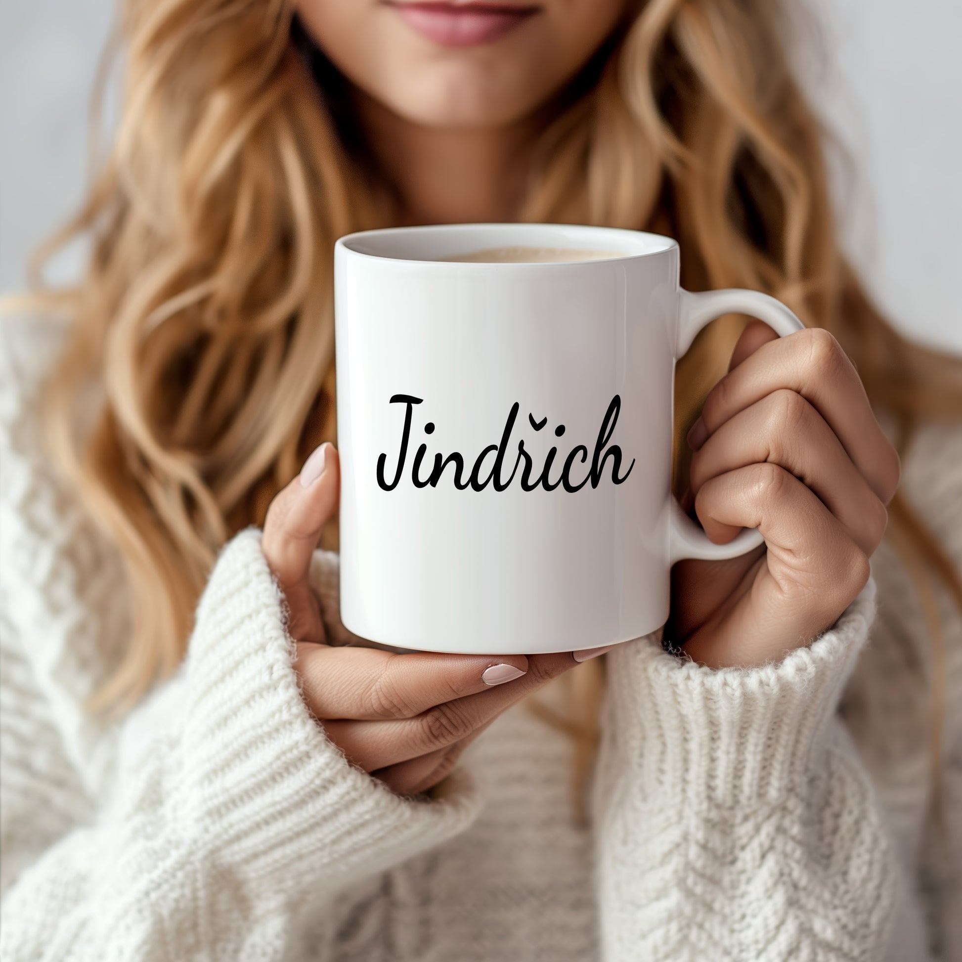 Jednoduchý bílý hrnek se jménem Jindřich v čistém moderním fontu. Praktický dárek do kanceláře i domů.