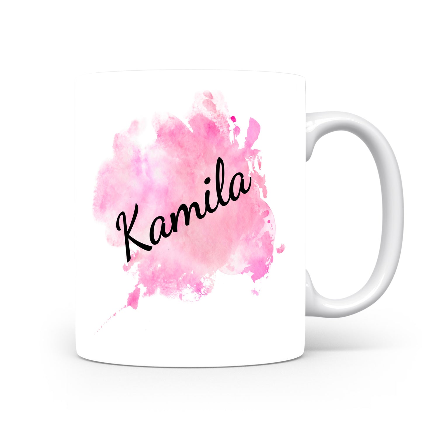 Stylový hrnek se jménem Kamila s jemným růžovým akvarelovým motivem. Elegantní a hravý zároveň.