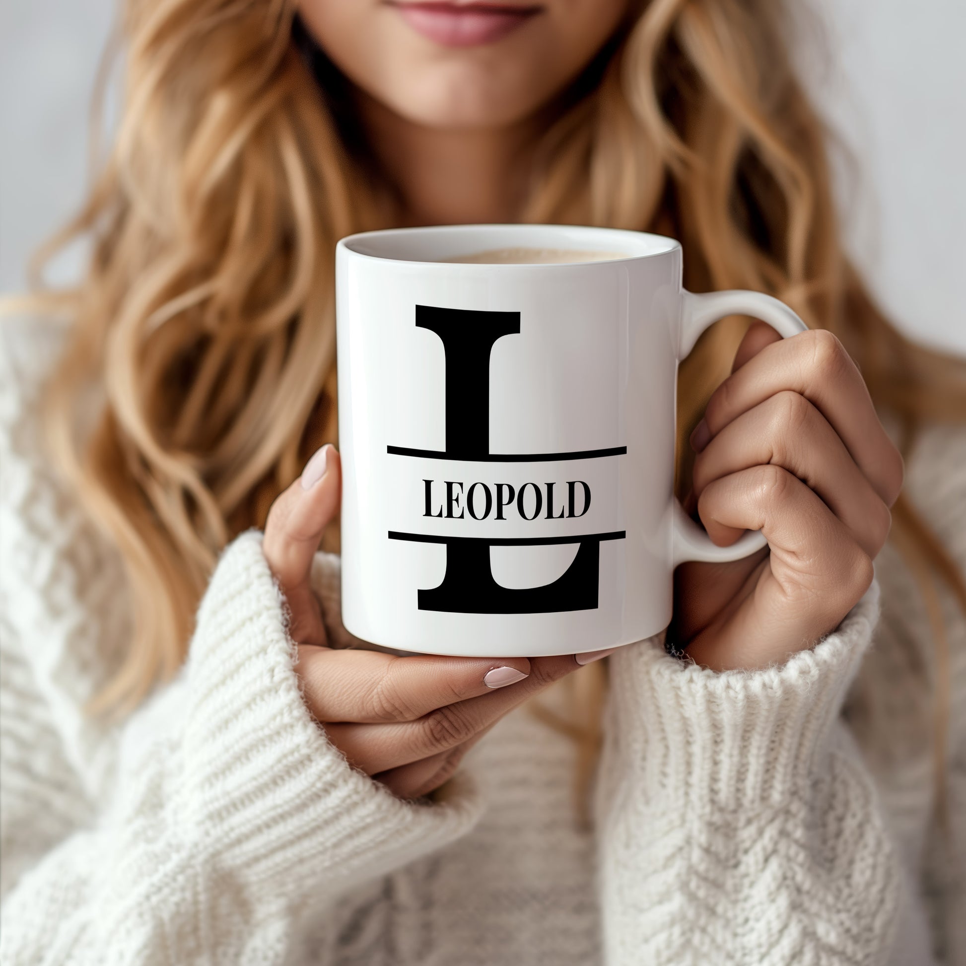 Stylový černobílý hrnek s iniciálou a jménem Leopold v jednoduchém moderním designu. Elegantní osobní dárek pro muže.