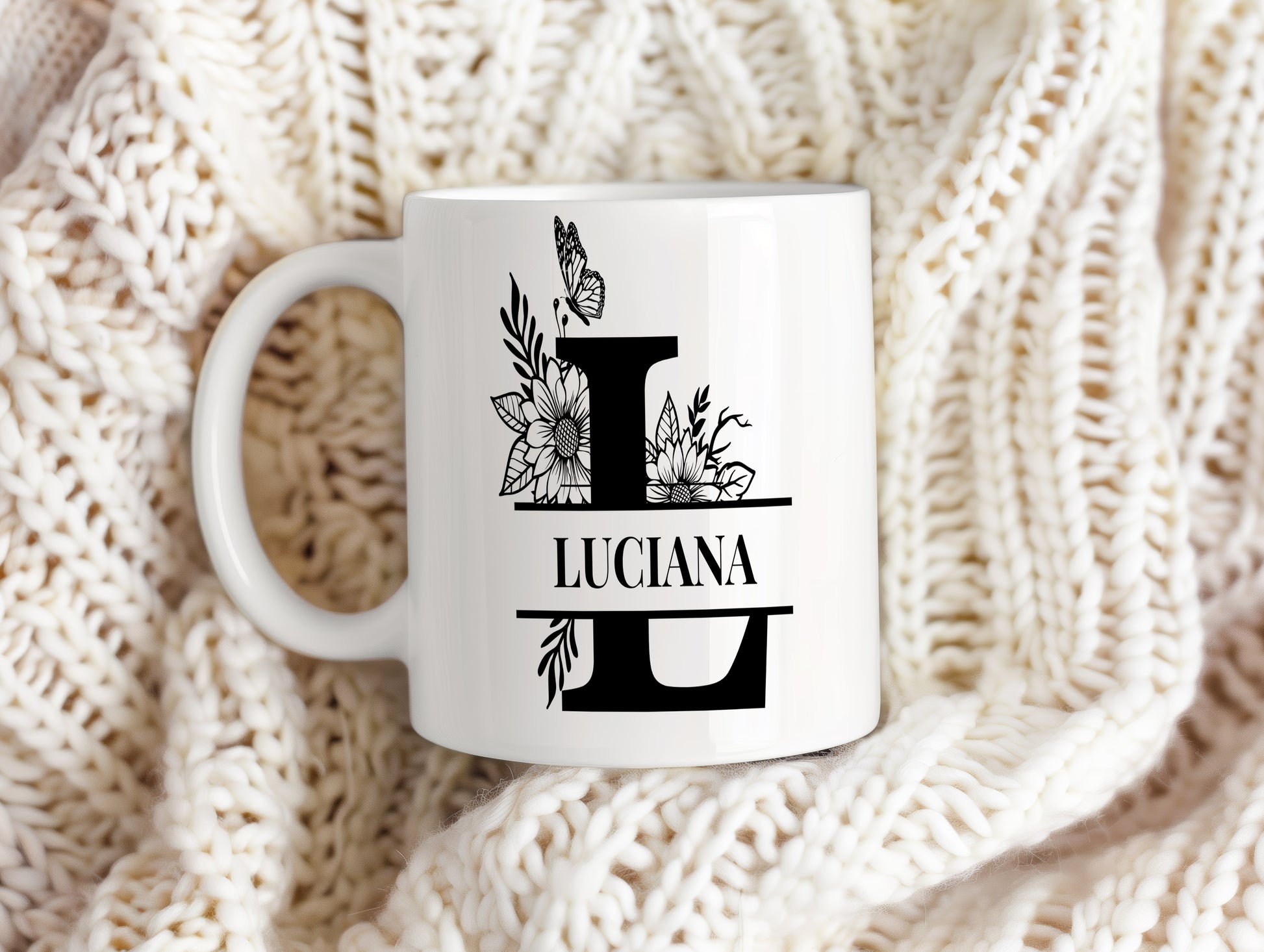 Elegantní hrnek se jménem Luciana s monogramem zdobeným jemnými květinami. Skvělý osobní dárek pro ženy.