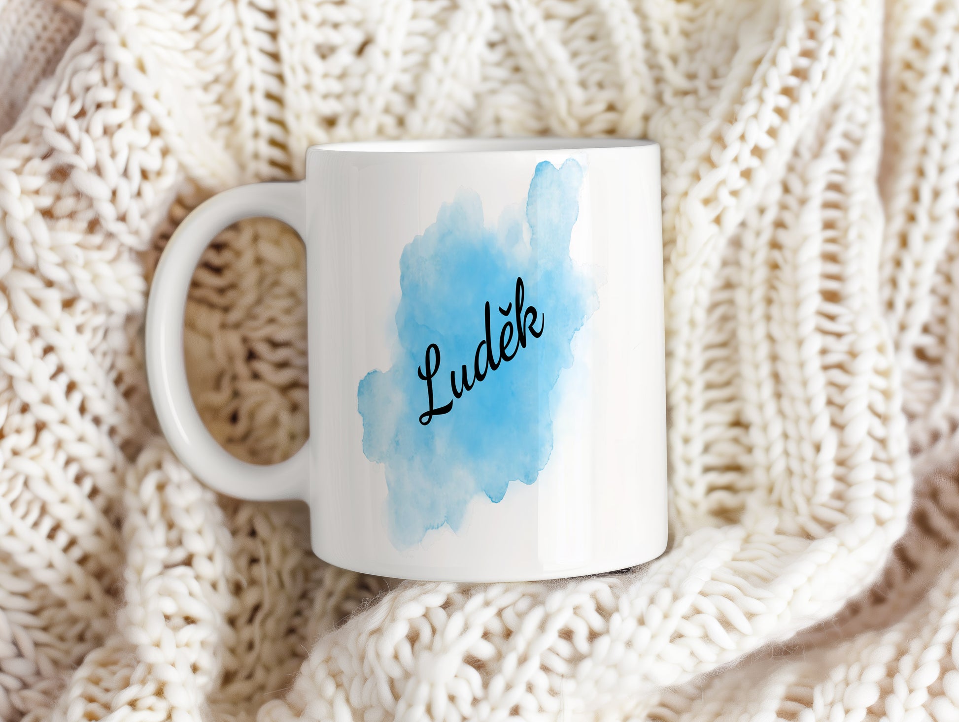 Originální hrnek se jménem Luděk s modrým akvarelovým podkladem. Svěží design pro každý den.
