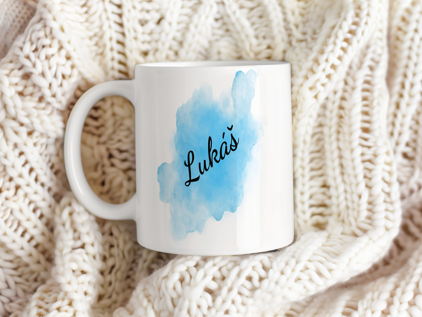 Originální hrnek se jménem Lukáš s modrým akvarelovým podkladem. Svěží design pro každý den.