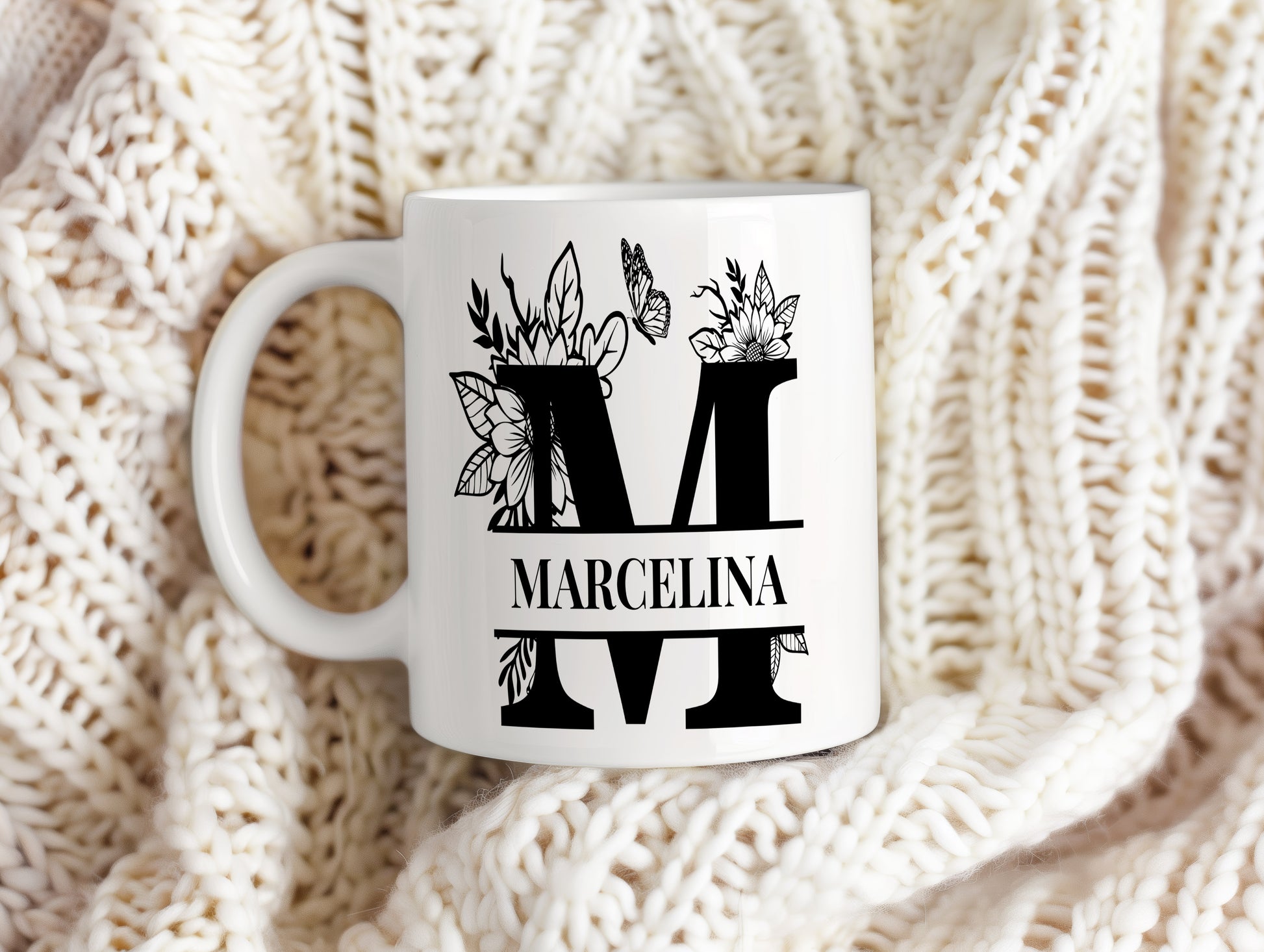 Elegantní hrnek se jménem Marcelina s monogramem zdobeným jemnými květinami. Skvělý osobní dárek pro ženy.
