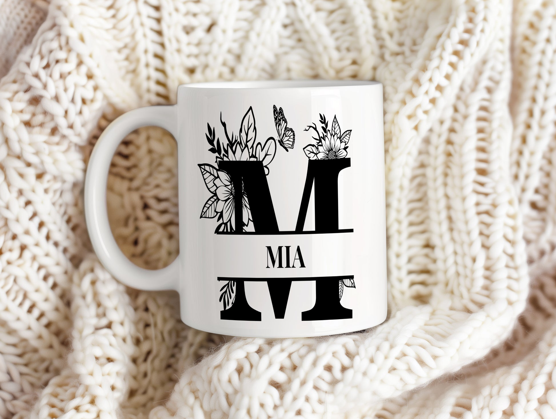 Elegantní hrnek se jménem Mia s monogramem zdobeným jemnými květinami. Skvělý osobní dárek pro ženy.