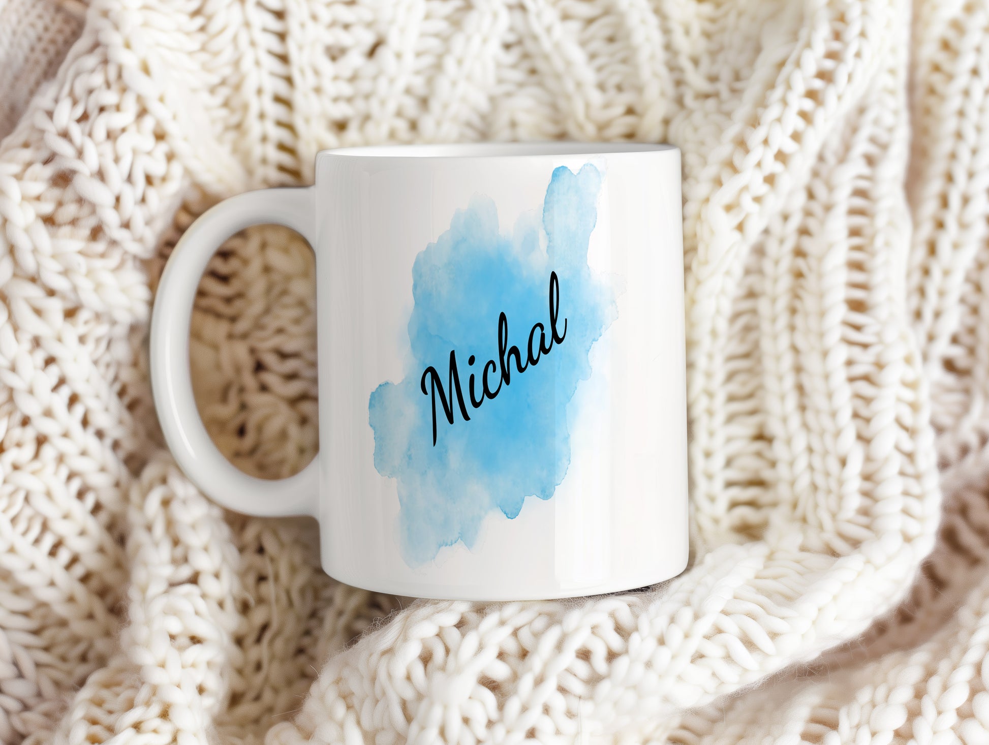 Originální hrnek se jménem Michal s modrým akvarelovým podkladem. Svěží design pro každý den.
