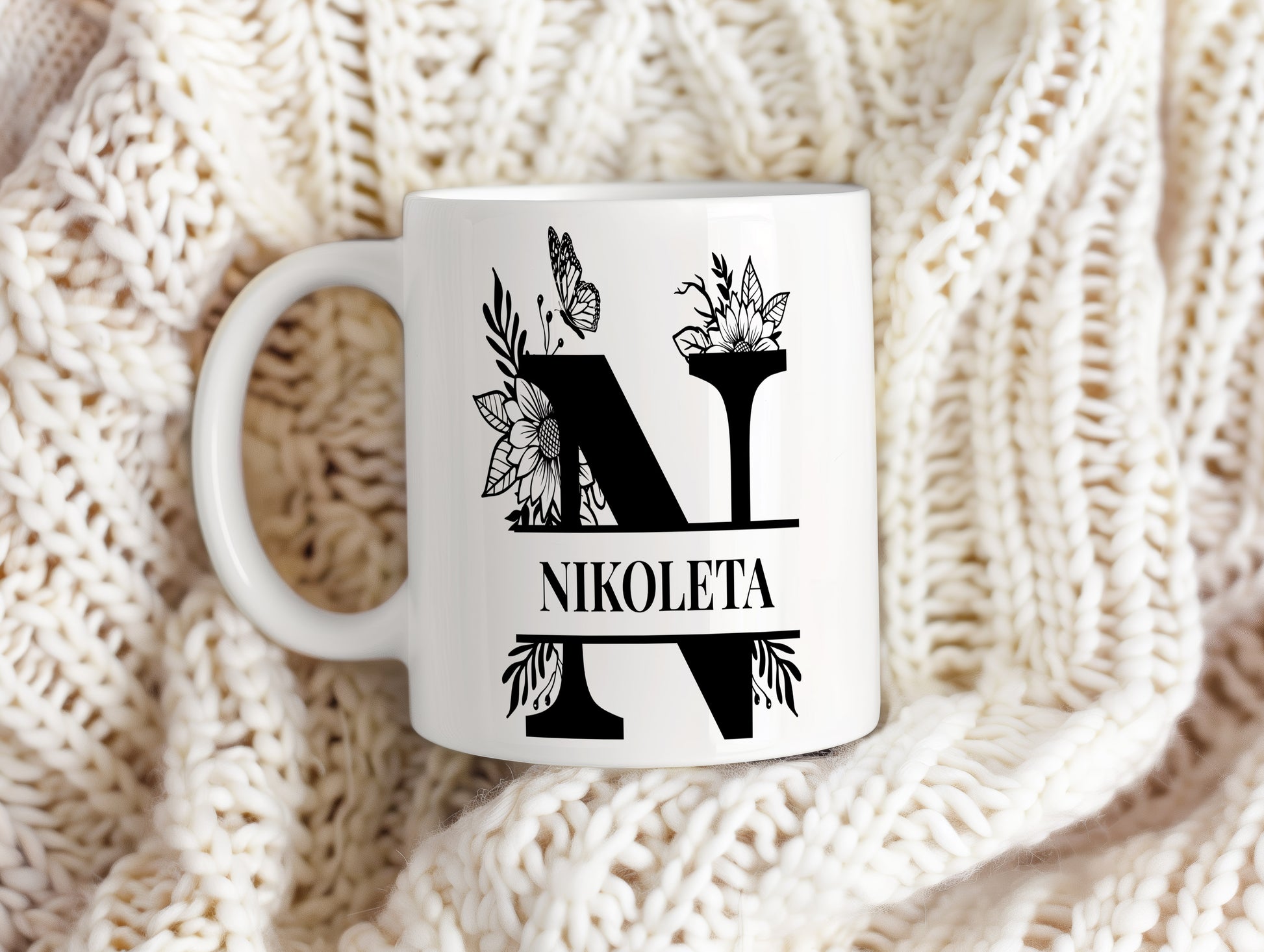 Elegantní hrnek se jménem Nikoleta s monogramem zdobeným jemnými květinami. Skvělý osobní dárek pro ženy.
