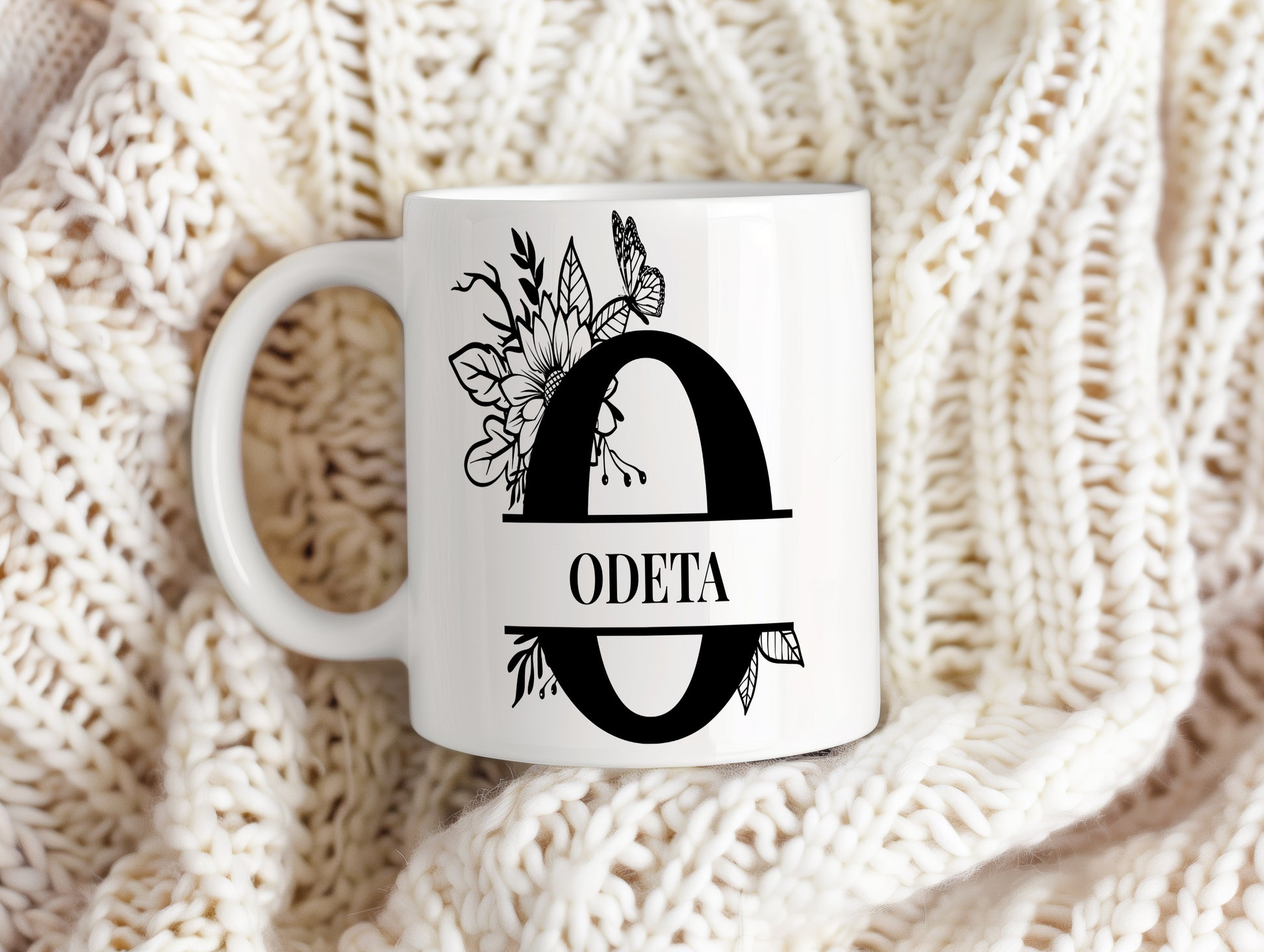 Elegantní hrnek se jménem Odeta s monogramem zdobeným jemnými květinami. Skvělý osobní dárek pro ženy.