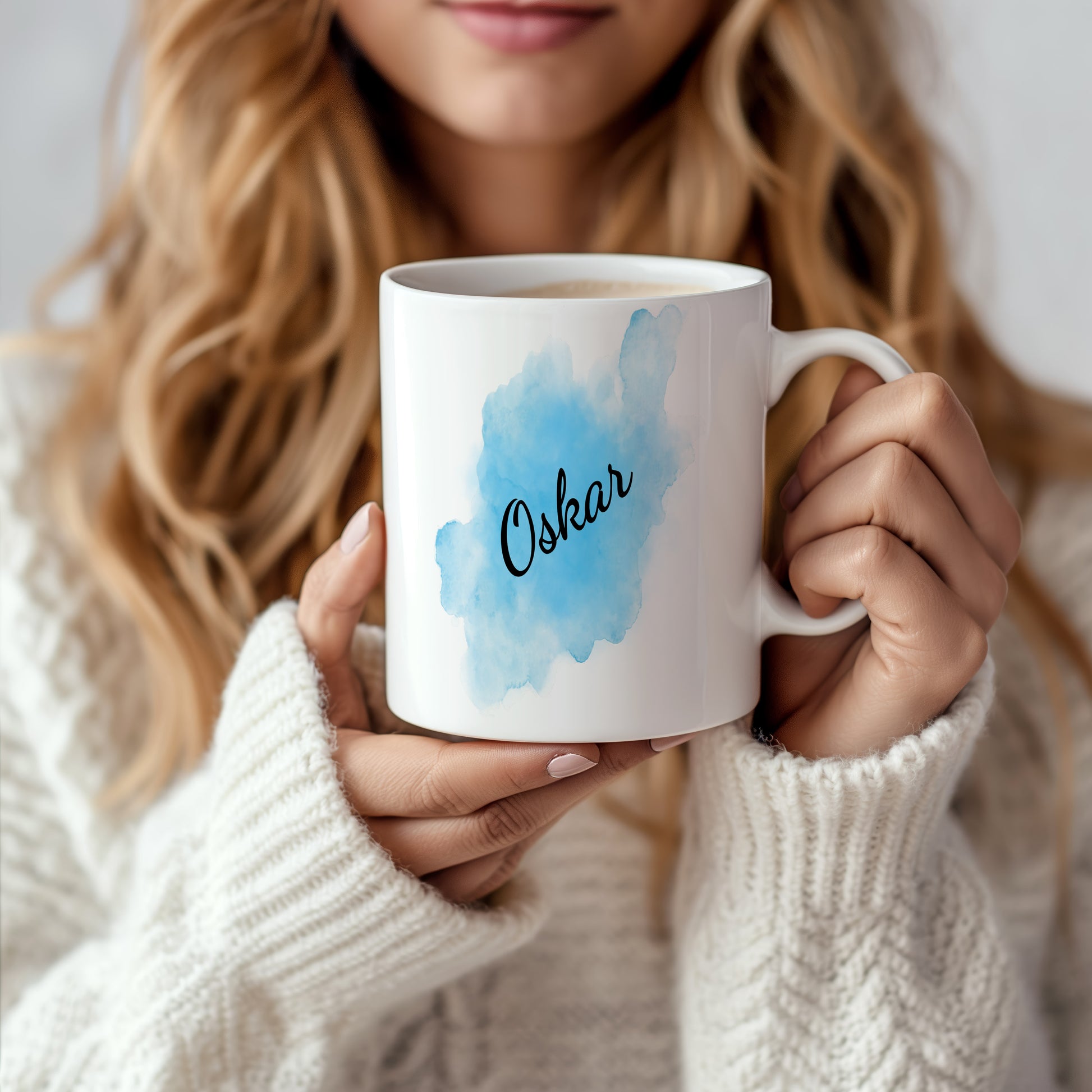 Originální hrnek se jménem Oskar s modrým akvarelovým podkladem. Svěží design pro každý den.