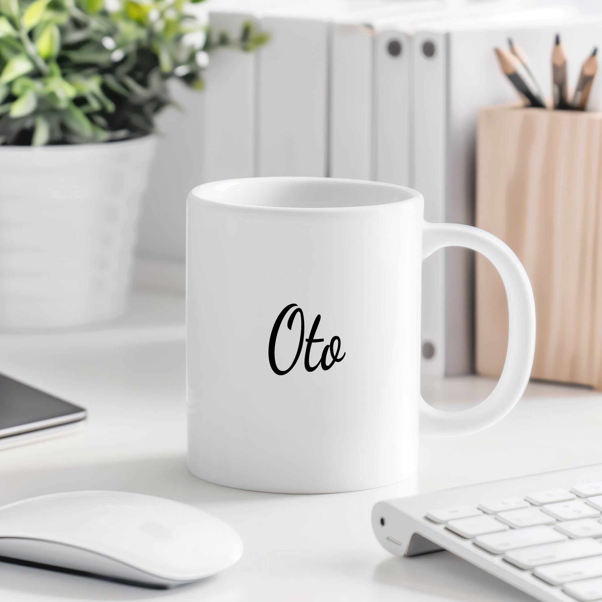 Jednoduchý bílý hrnek se jménem Oto v čistém moderním fontu. Praktický dárek do kanceláře i domů.