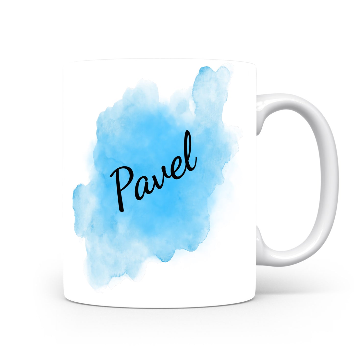Originální hrnek se jménem Pavel s modrým akvarelovým podkladem. Svěží design pro každý den.