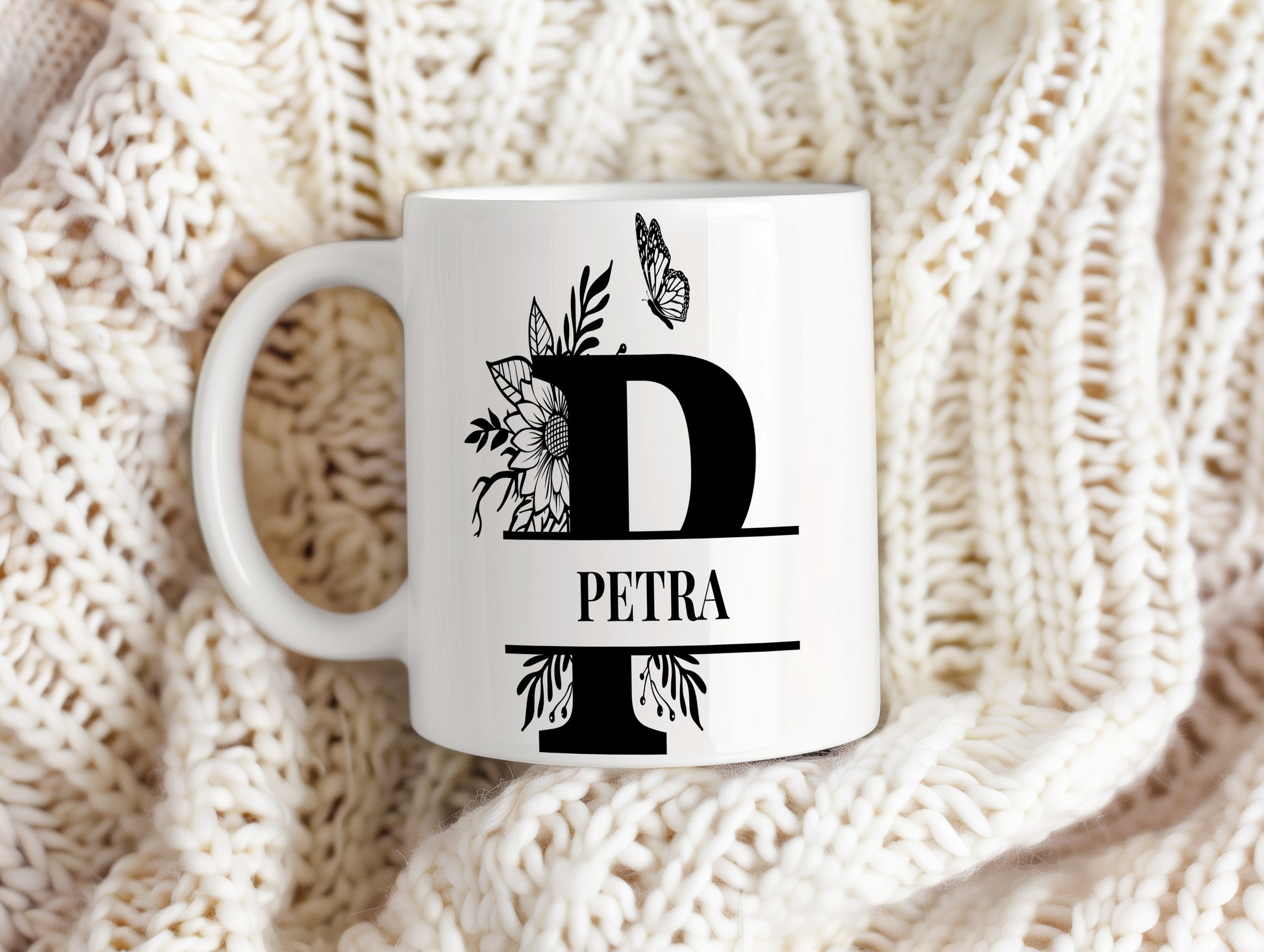 Elegantní hrnek se jménem Petra s monogramem zdobeným jemnými květinami. Skvělý osobní dárek pro ženy.