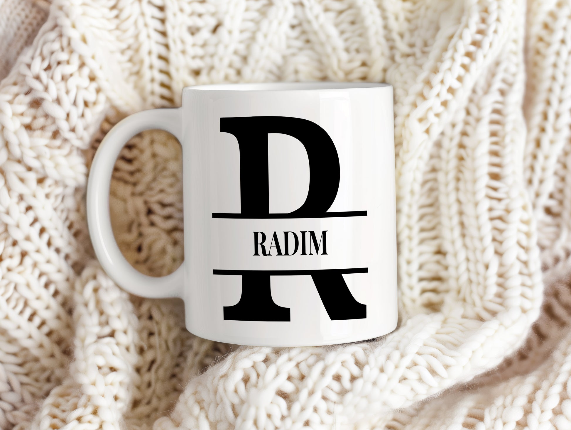 Stylový černobílý hrnek s iniciálou a jménem Radim v jednoduchém moderním designu. Elegantní osobní dárek pro muže.