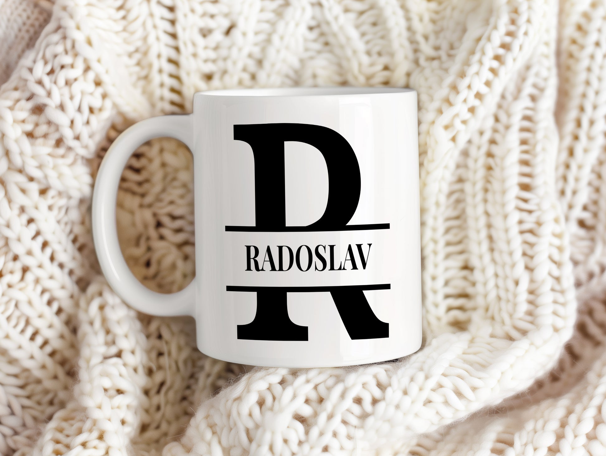 Stylový černobílý hrnek s iniciálou a jménem Radoslav v jednoduchém moderním designu. Elegantní osobní dárek pro muže.