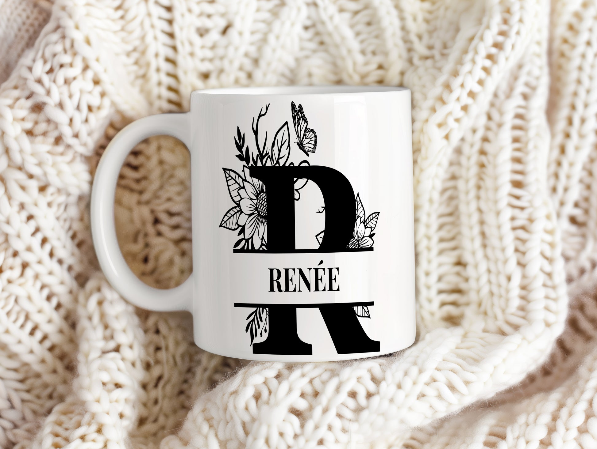 Elegantní hrnek se jménem Renée s monogramem zdobeným jemnými květinami. Skvělý osobní dárek pro ženy.