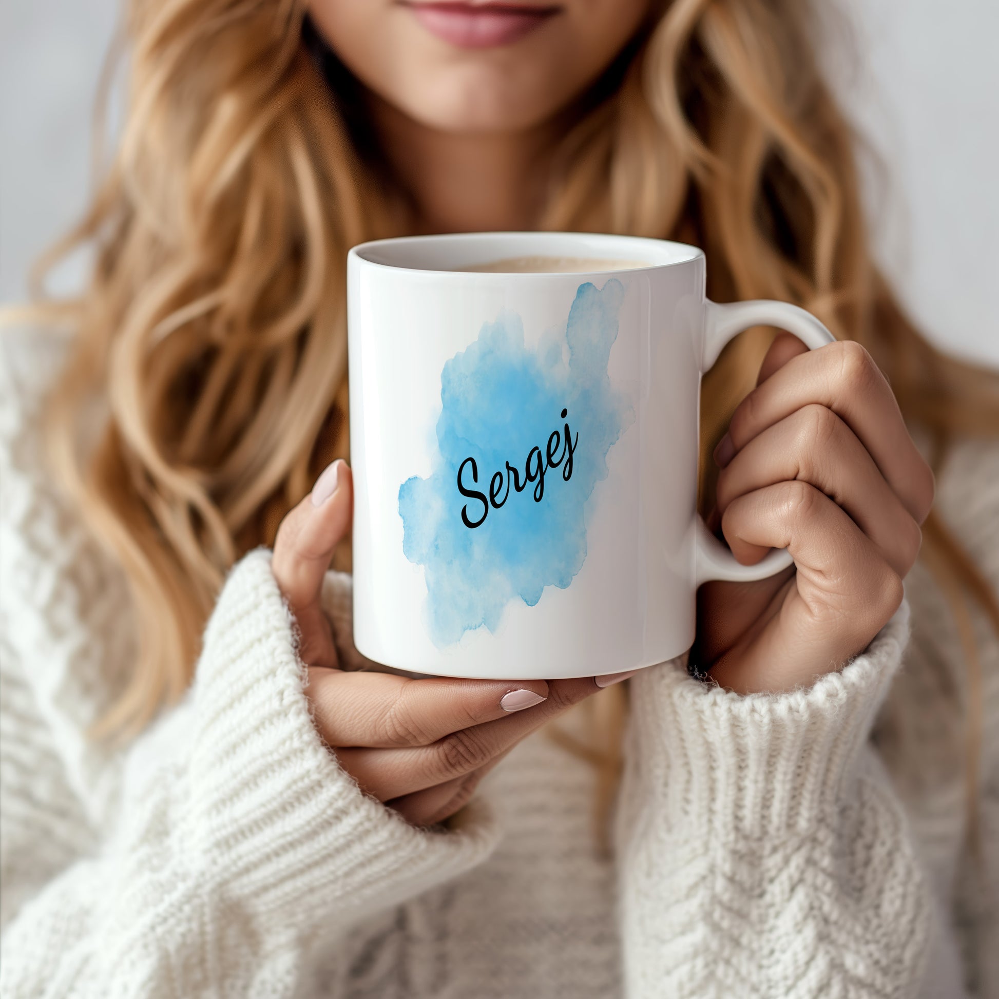 Originální hrnek se jménem Sergej s modrým akvarelovým podkladem. Svěží design pro každý den.
