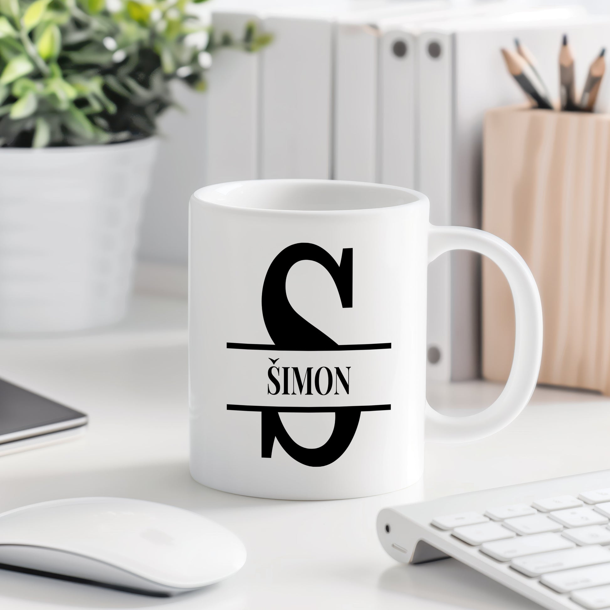 Stylový černobílý hrnek s iniciálou a jménem ŠIMON v jednoduchém moderním designu. Elegantní osobní dárek pro muže.