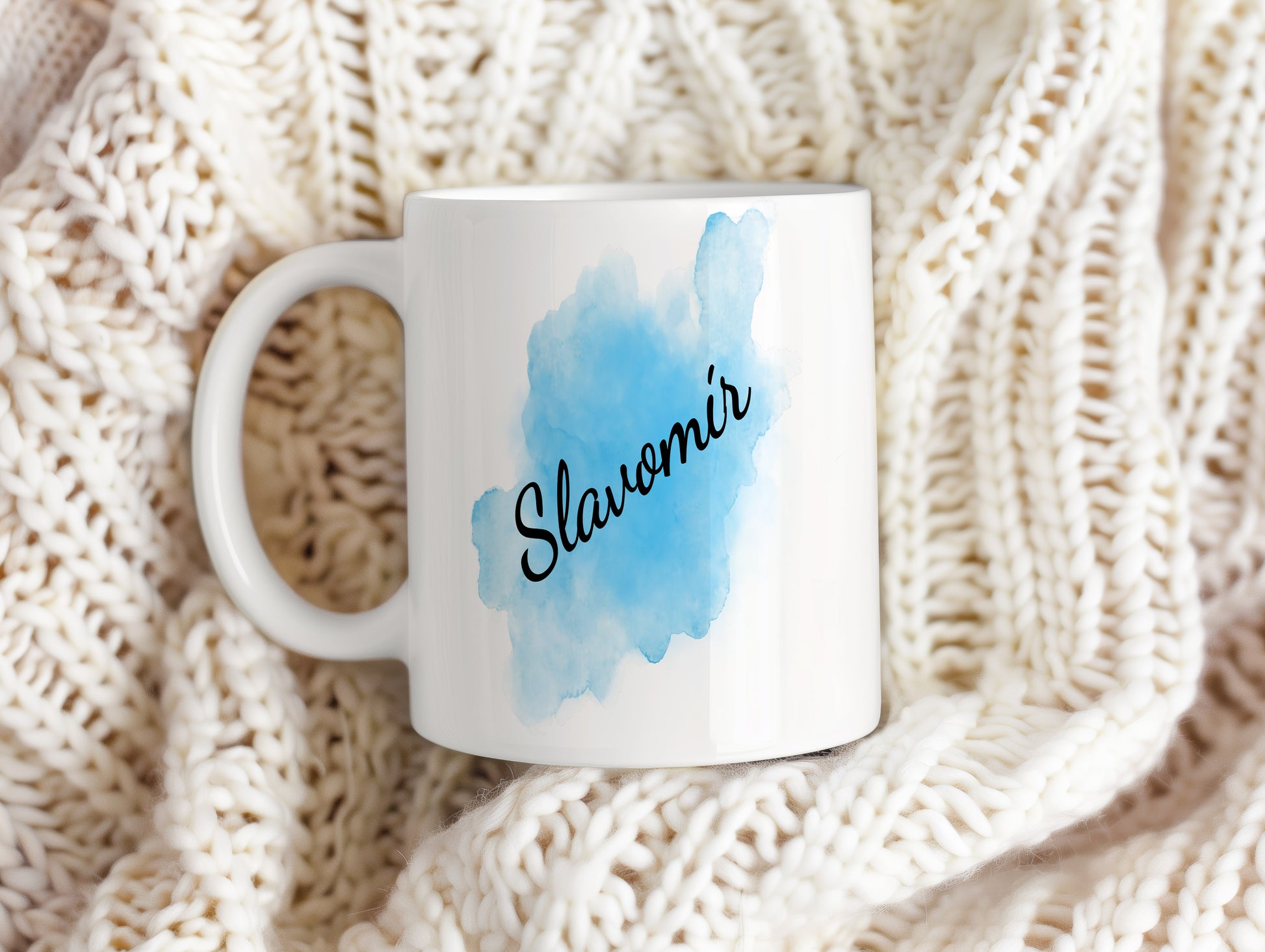 Originální hrnek se jménem Slavomír s modrým akvarelovým podkladem. Svěží design pro každý den.