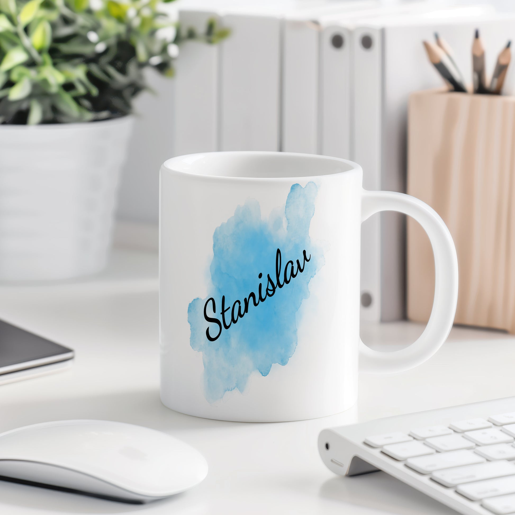 Originální hrnek se jménem Stanislav s modrým akvarelovým podkladem. Svěží design pro každý den.