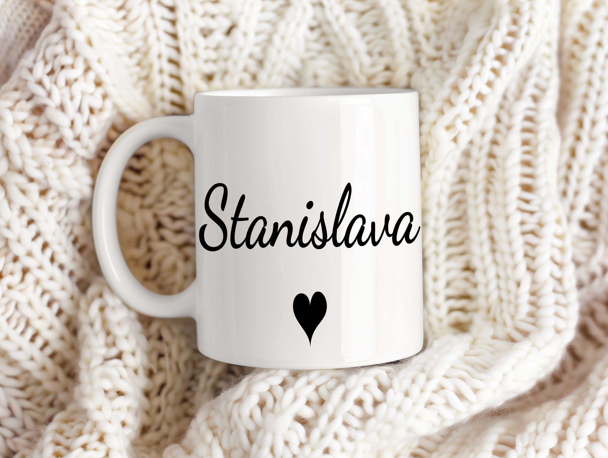 Romantický hrnek se jménem Stanislava doplněný decentním symbolem ♥. Krásný dárek k Valentýnu i jen tak pro radost.
