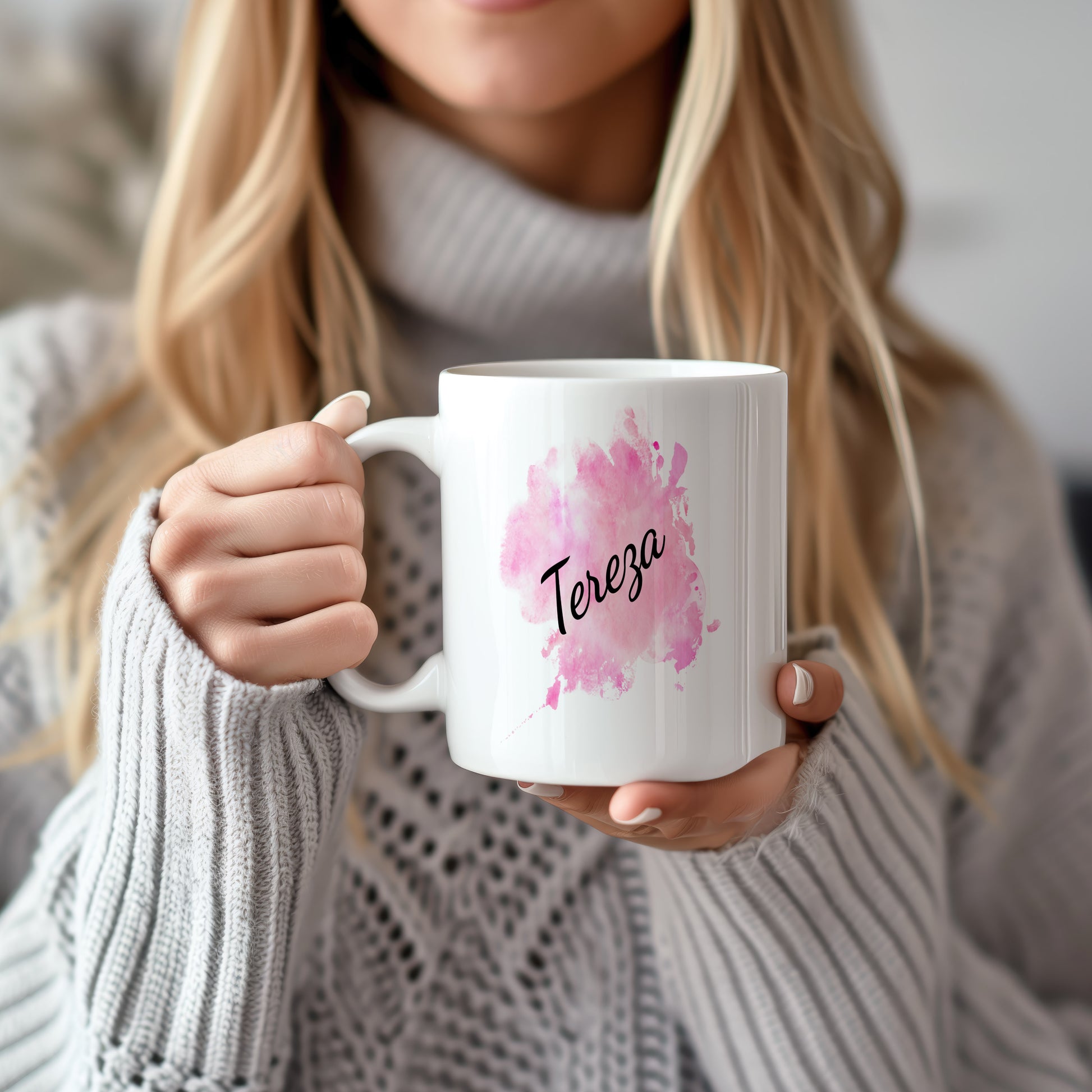 Stylový hrnek se jménem Tereza s jemným růžovým akvarelovým motivem. Elegantní a hravý zároveň.