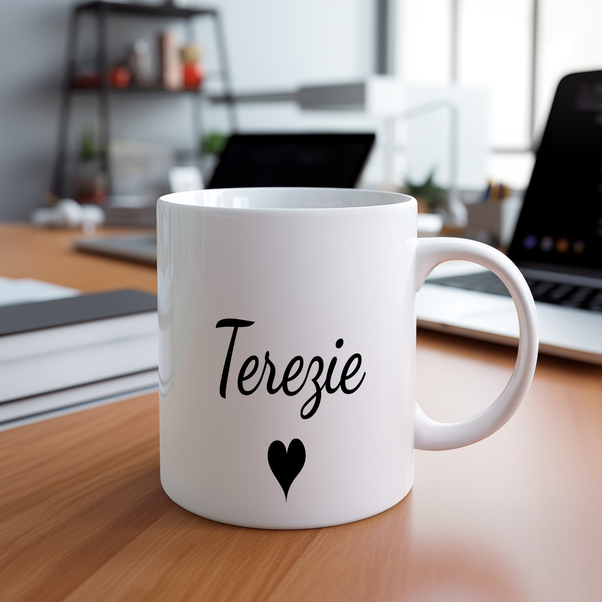 Romantický hrnek se jménem Terezie doplněný decentním symbolem ♥. Krásný dárek k Valentýnu i jen tak pro radost.