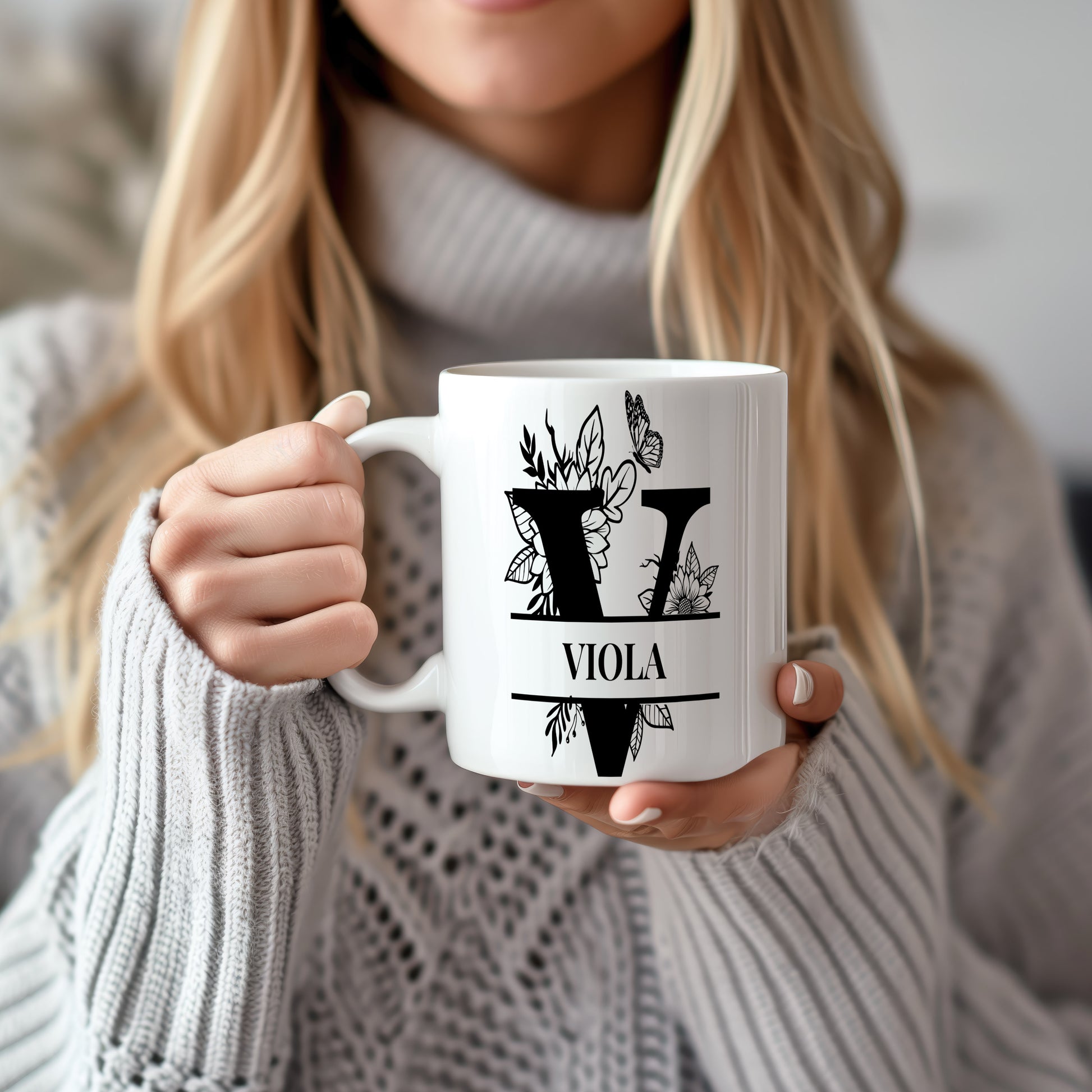 Elegantní hrnek se jménem Viola s monogramem zdobeným jemnými květinami. Skvělý osobní dárek pro ženy.