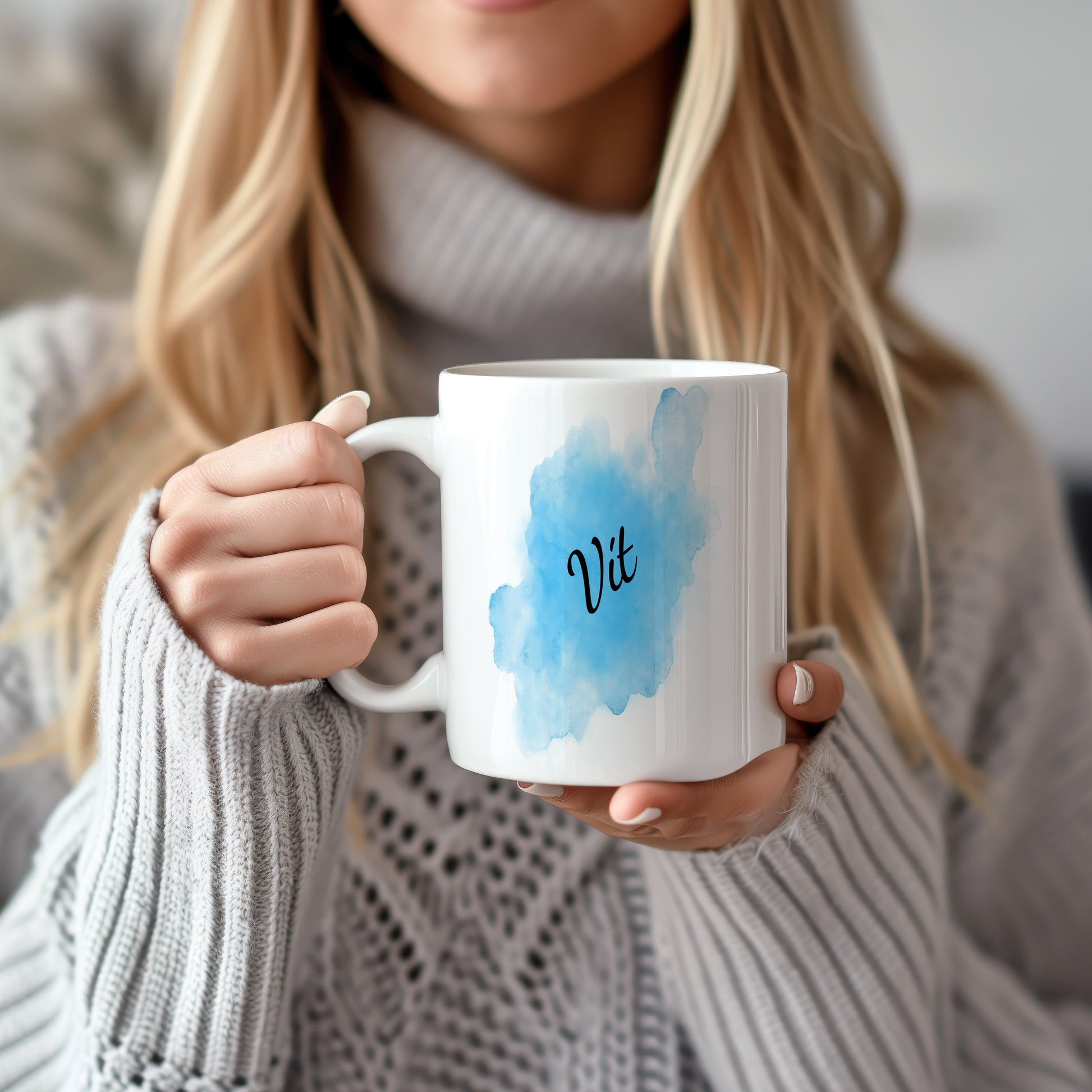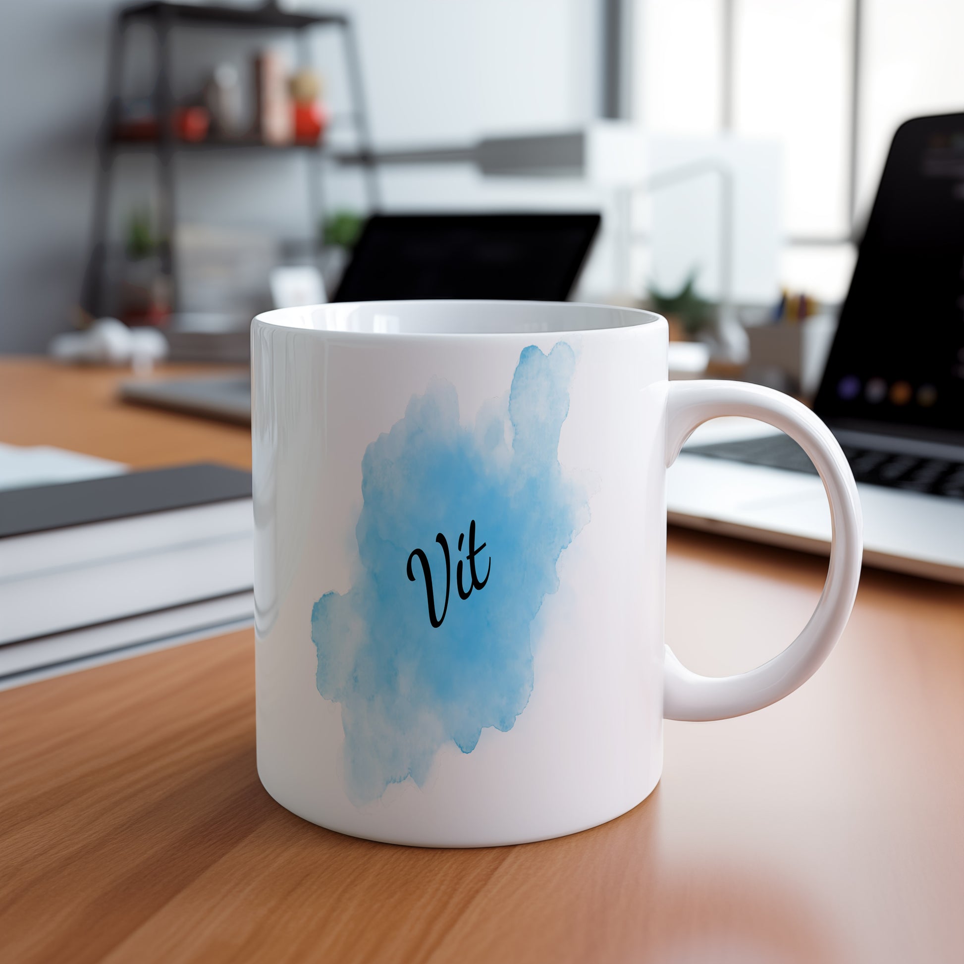 Originální hrnek se jménem Vit s modrým akvarelovým podkladem. Svěží design pro každý den.