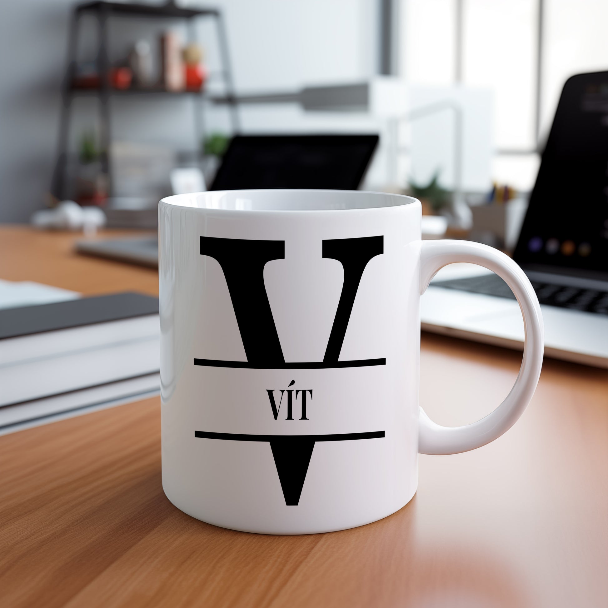 Stylový černobílý hrnek s iniciálou a jménem Vít v jednoduchém moderním designu. Elegantní osobní dárek pro muže.