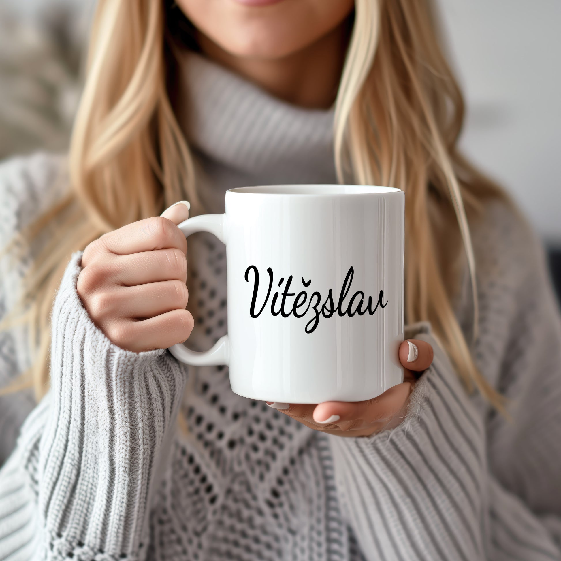 Jednoduchý bílý hrnek se jménem Vítězslav v čistém moderním fontu. Praktický dárek do kanceláře i domů.