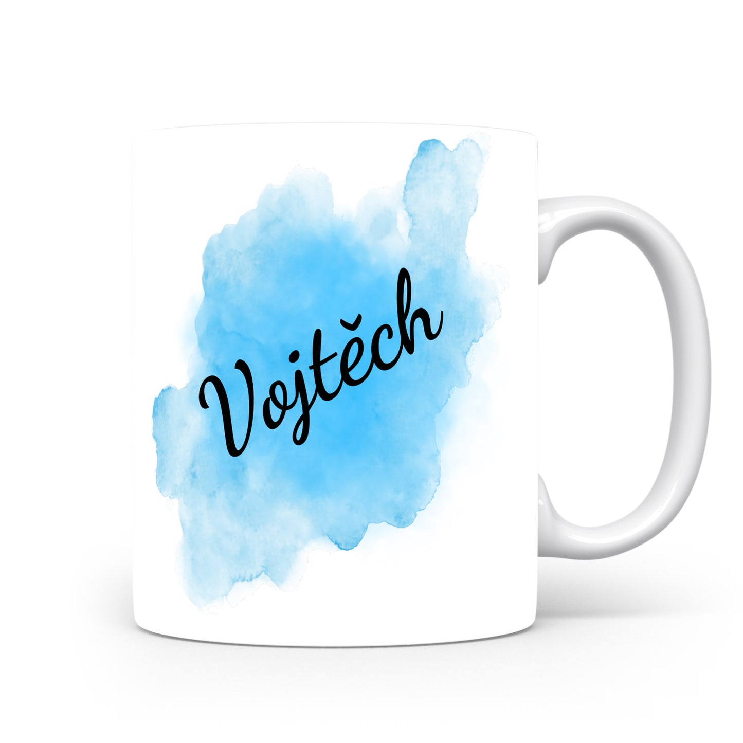 Originální hrnek se jménem Vojtěch s modrým akvarelovým podkladem. Svěží design pro každý den.