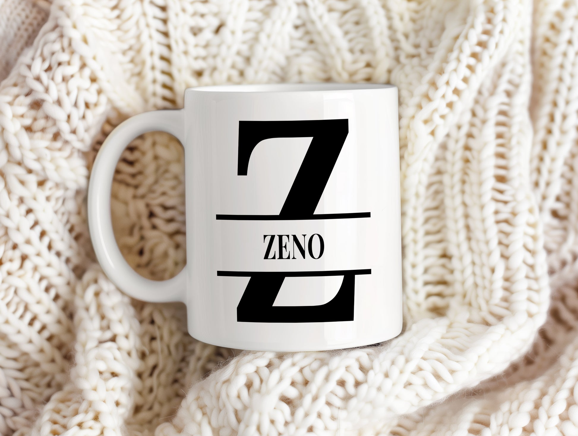 Stylový černobílý hrnek s iniciálou a jménem Zeno v jednoduchém moderním designu. Elegantní osobní dárek pro muže.