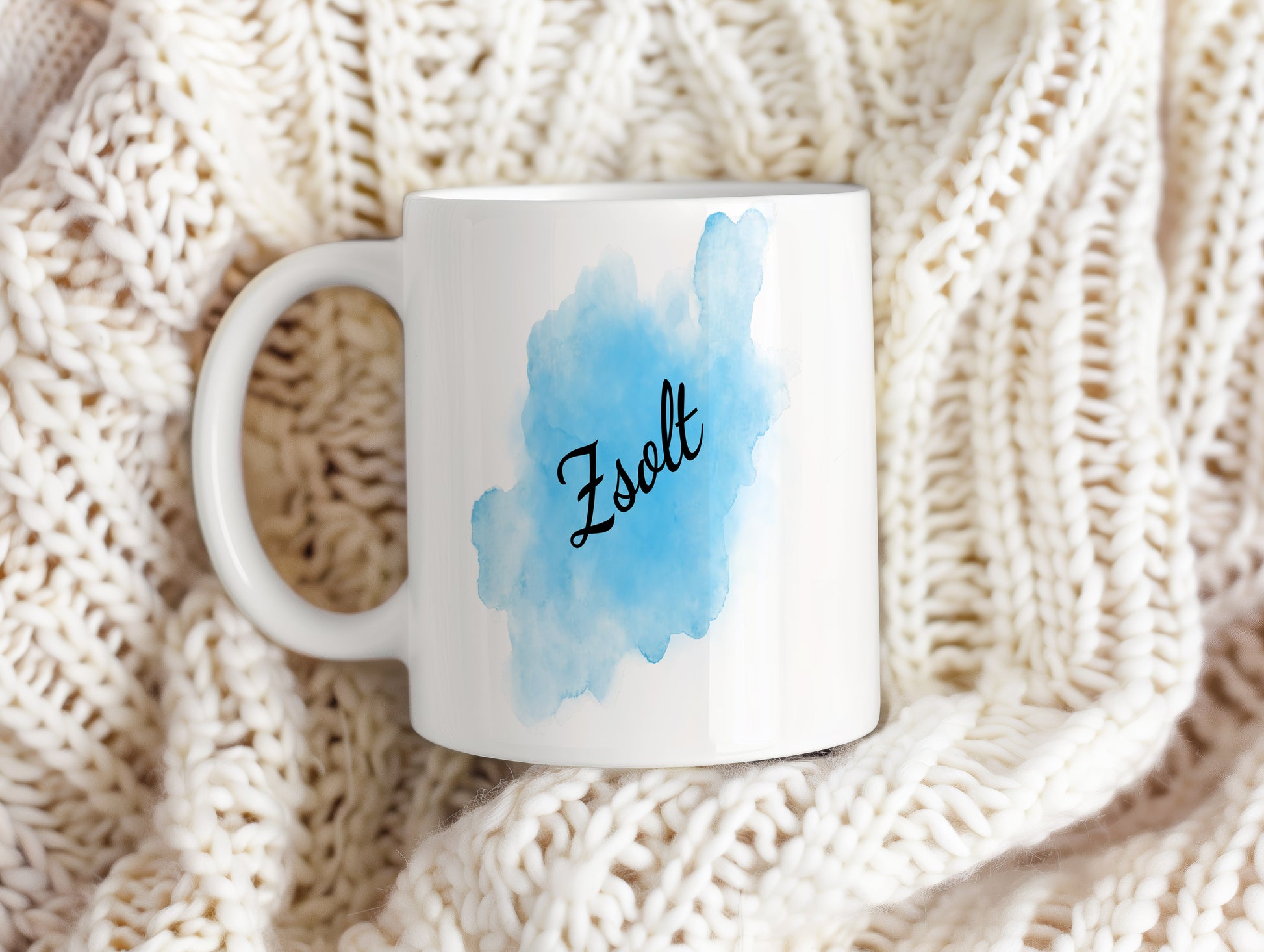 Originální hrnek se jménem Zsolt s modrým akvarelovým podkladem. Svěží design pro každý den.
