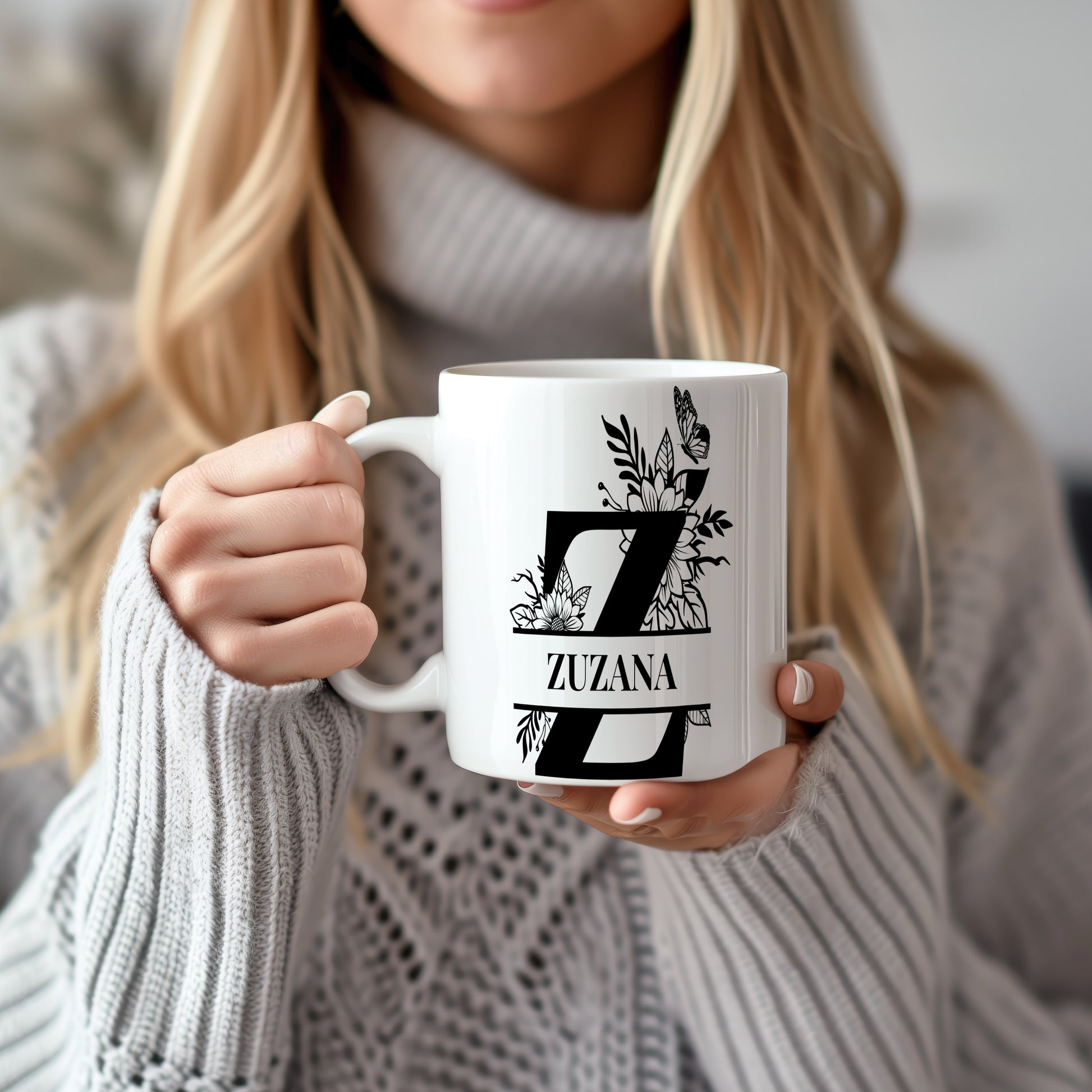 Elegantní hrnek se jménem Zuzana s monogramem zdobeným jemnými květinami. Skvělý osobní dárek pro ženy.