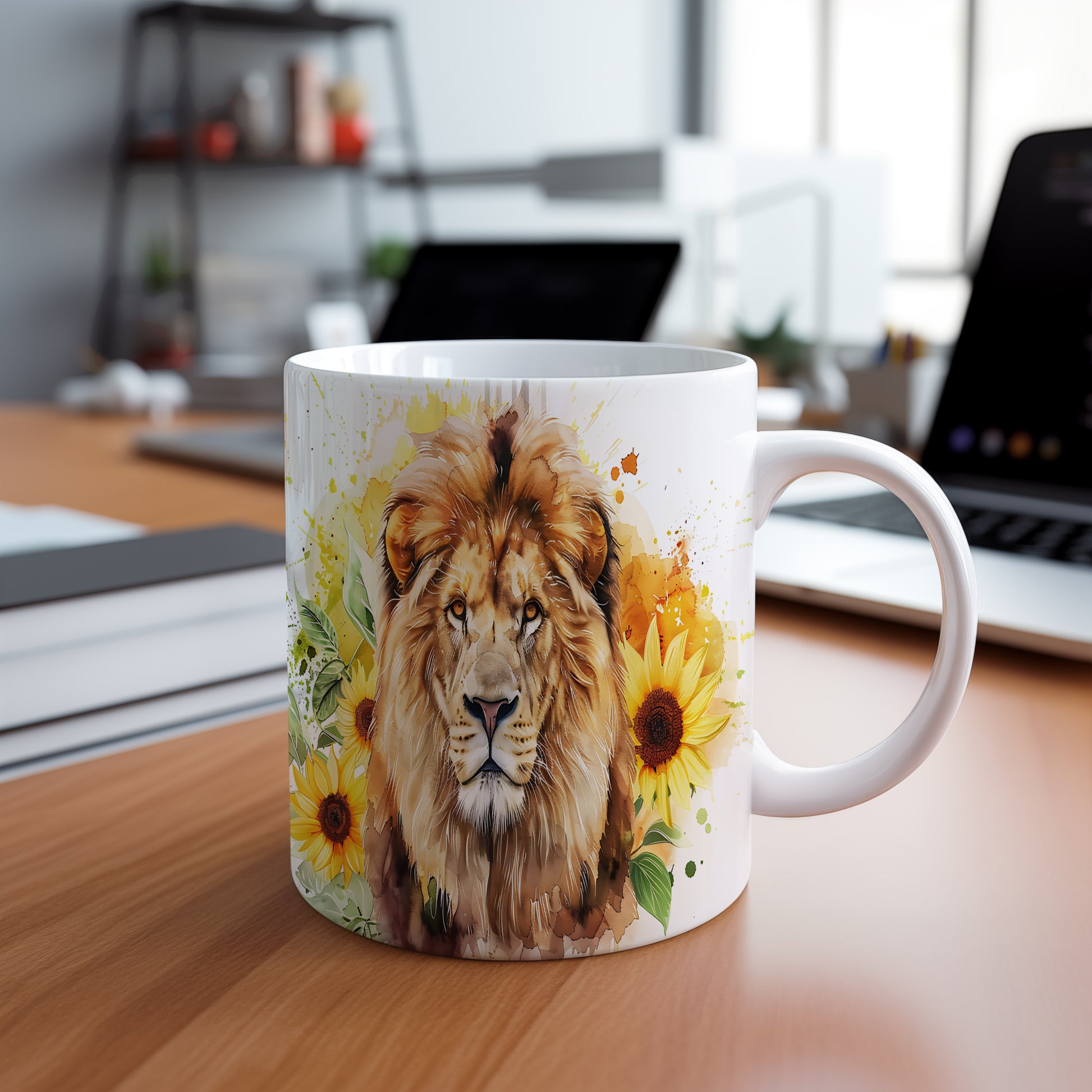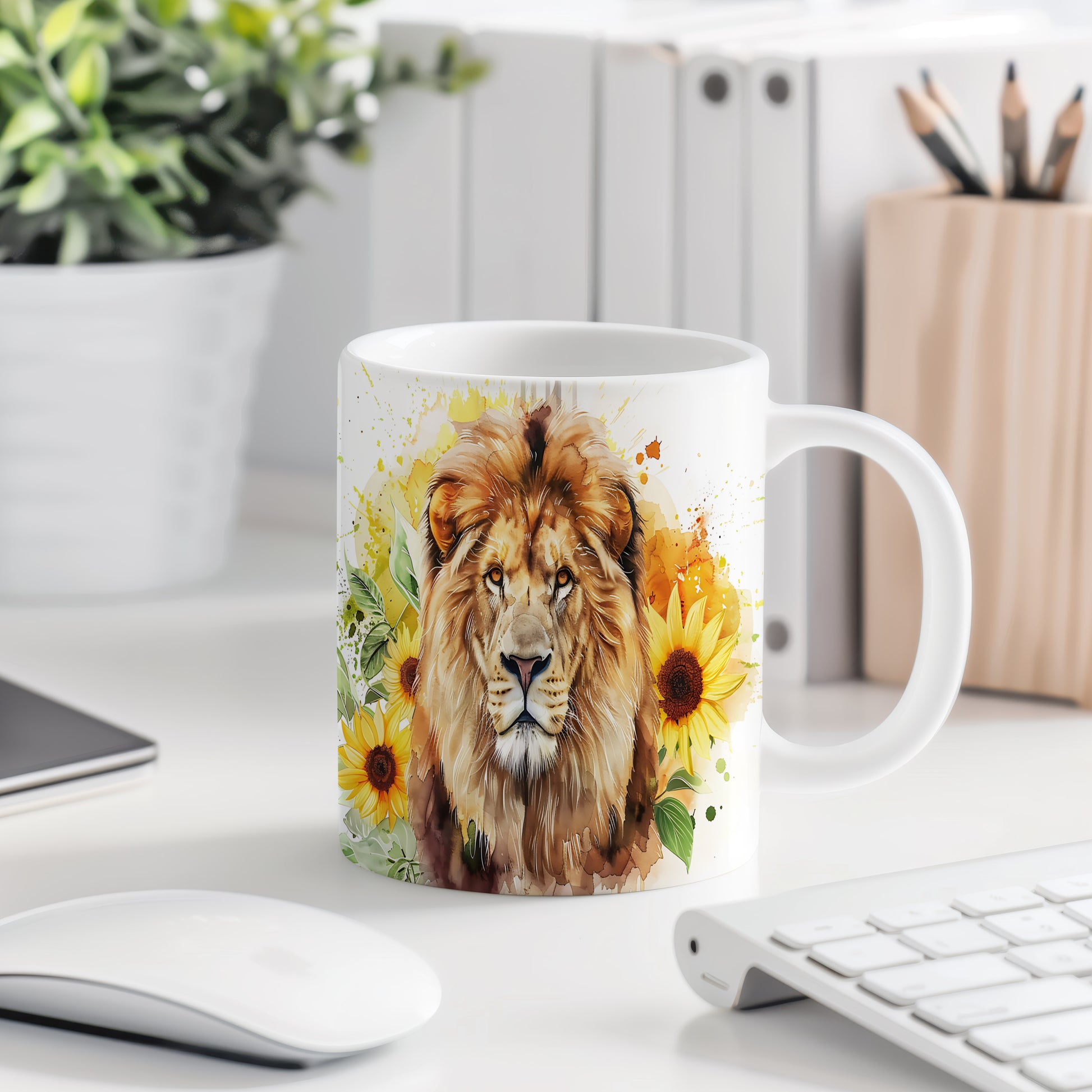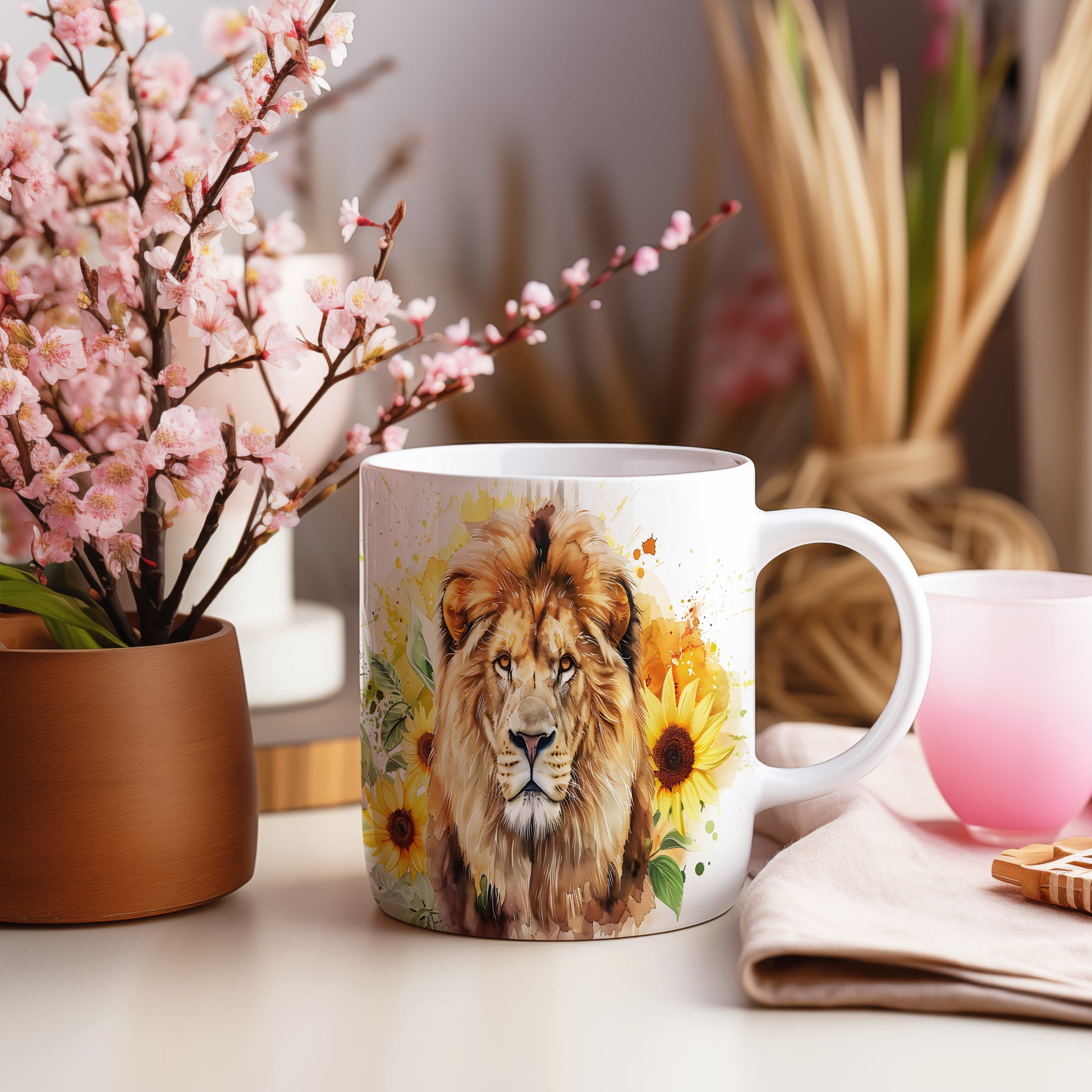 Stylový hrnek s motivem lví hlavy obklopené slunečnicemi. Tento unikátní kousek potěší milovníky zvířat a přírody, skvělý tip na dárek pro přátele nebo rodinu. Materiál: keramika. Objem: 330 ml. Vhodné do myčky i mikrovlnky. Používáním tohoto hrnku si užijete nejen krásný design, ale i pohodlné pití oblíbených nápojů.