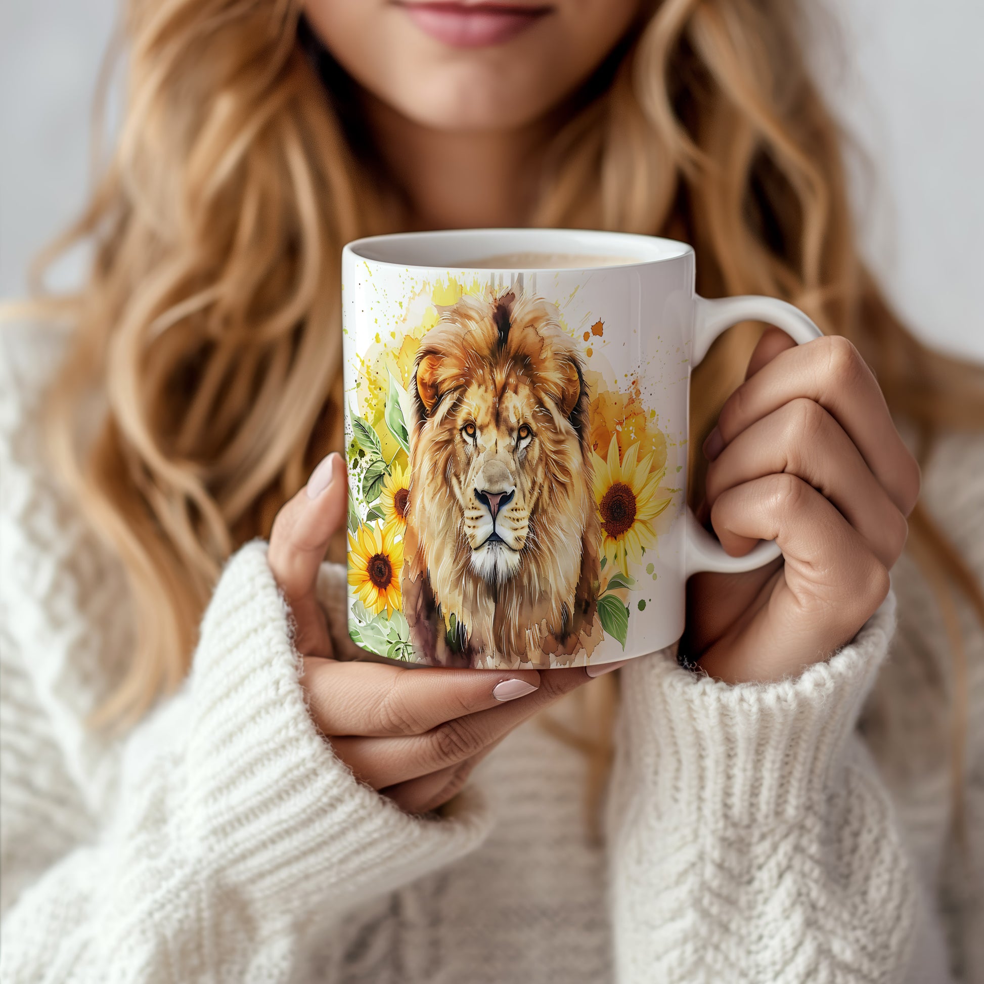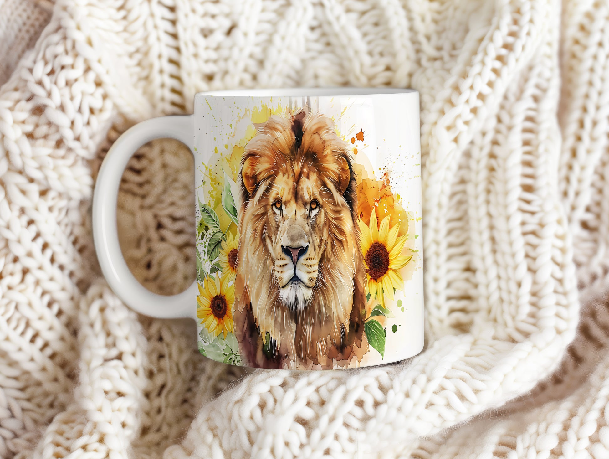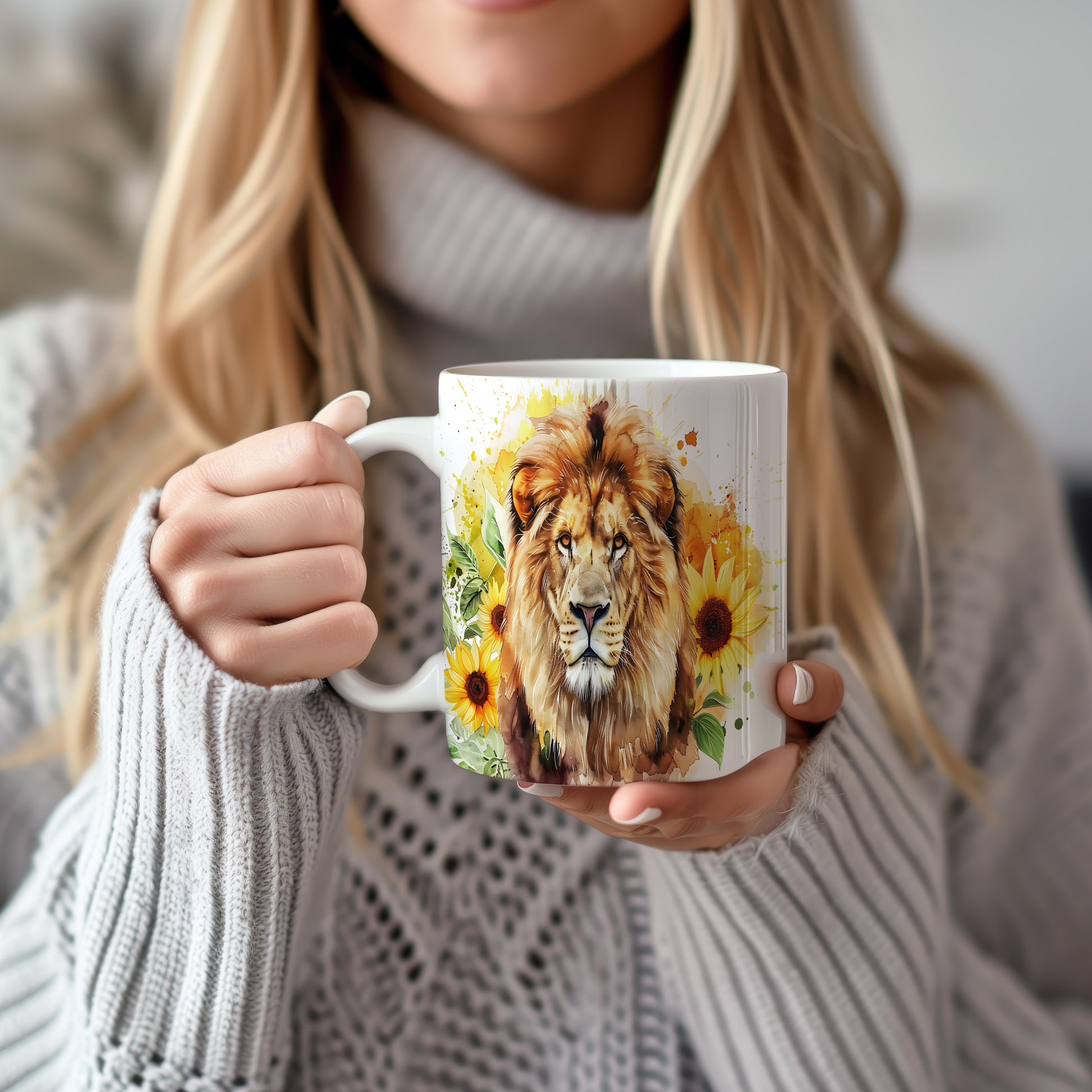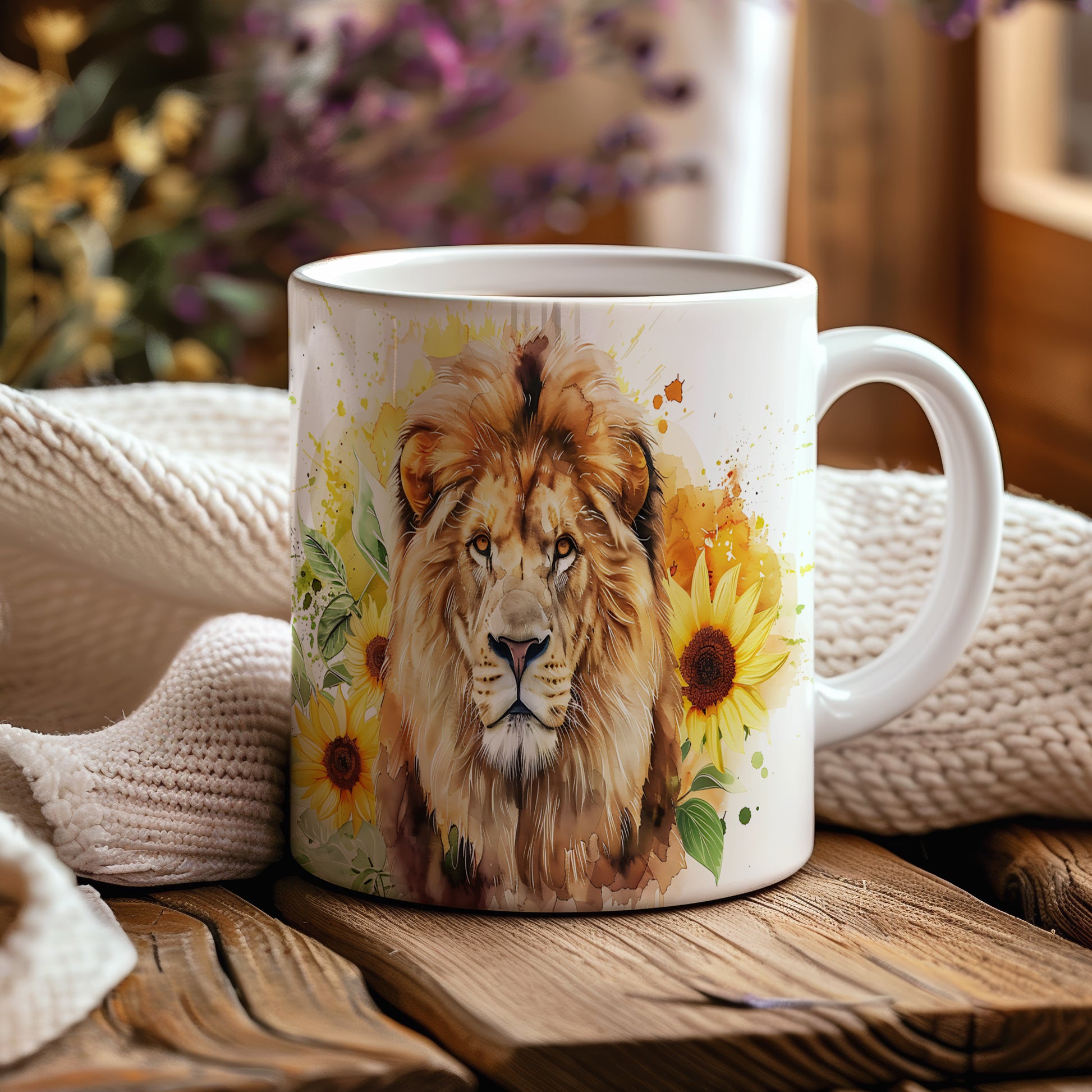 Stylový hrnek s motivem lví hlavy obklopené slunečnicemi. Tento unikátní kousek potěší milovníky zvířat a přírody, skvělý tip na dárek pro přátele nebo rodinu. Materiál: keramika. Objem: 330 ml. Vhodné do myčky i mikrovlnky. Používáním tohoto hrnku si užijete nejen krásný design, ale i pohodlné pití oblíbených nápojů.