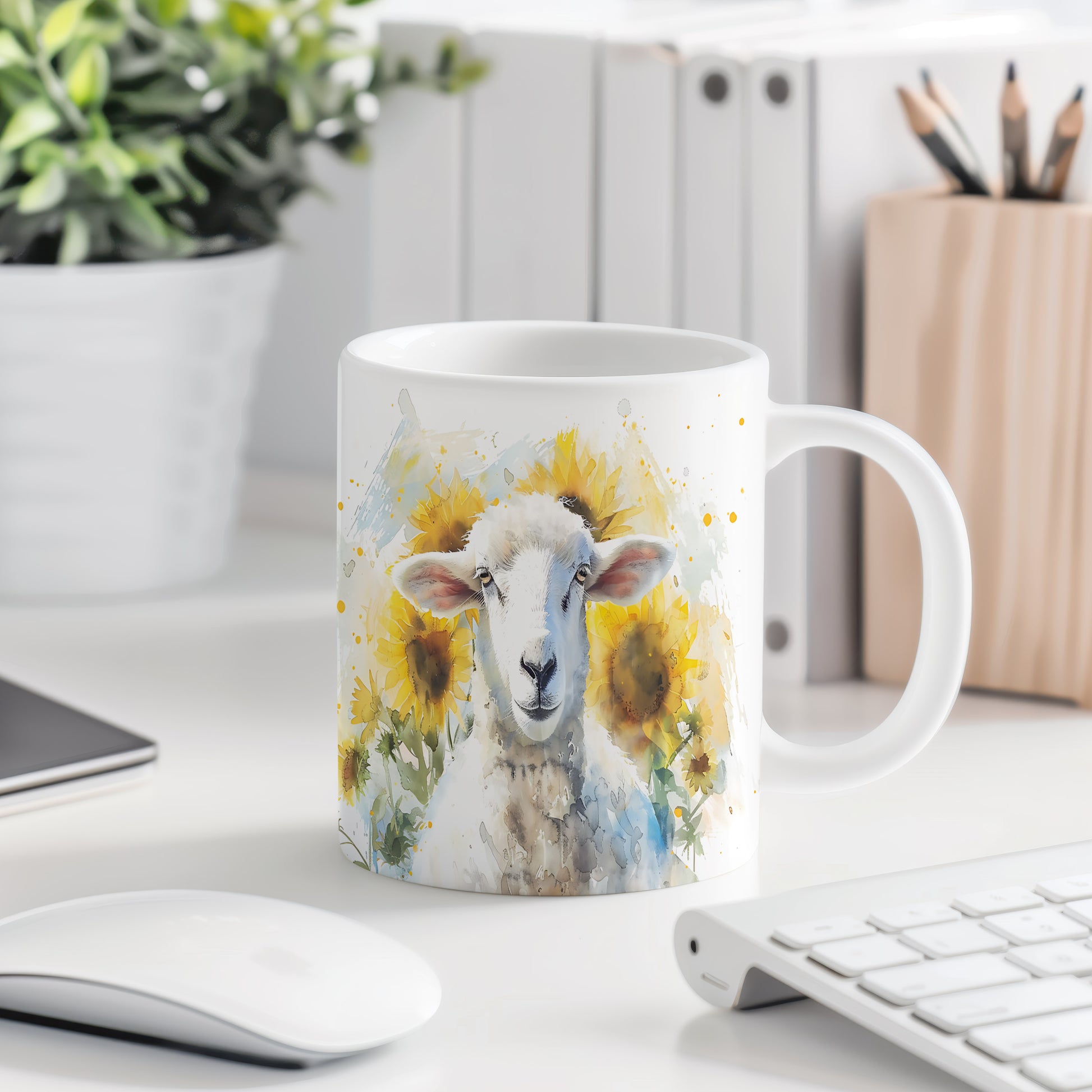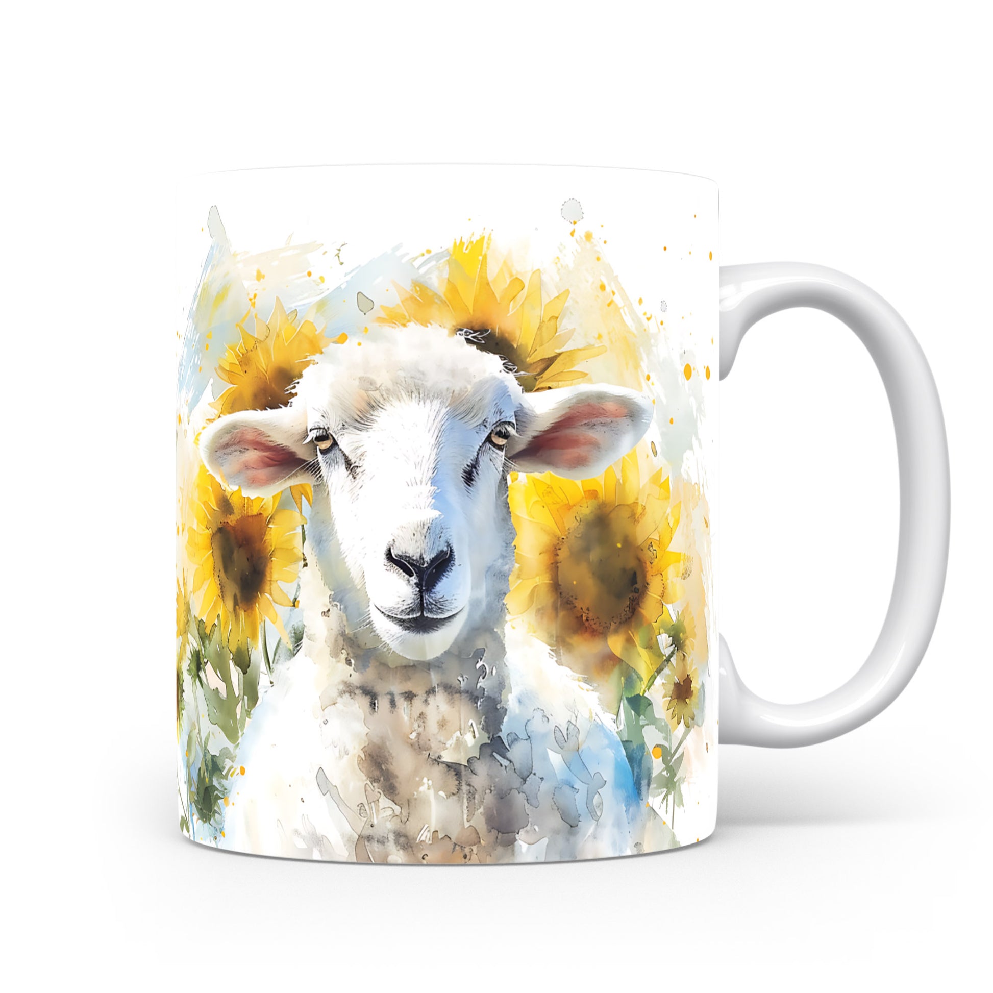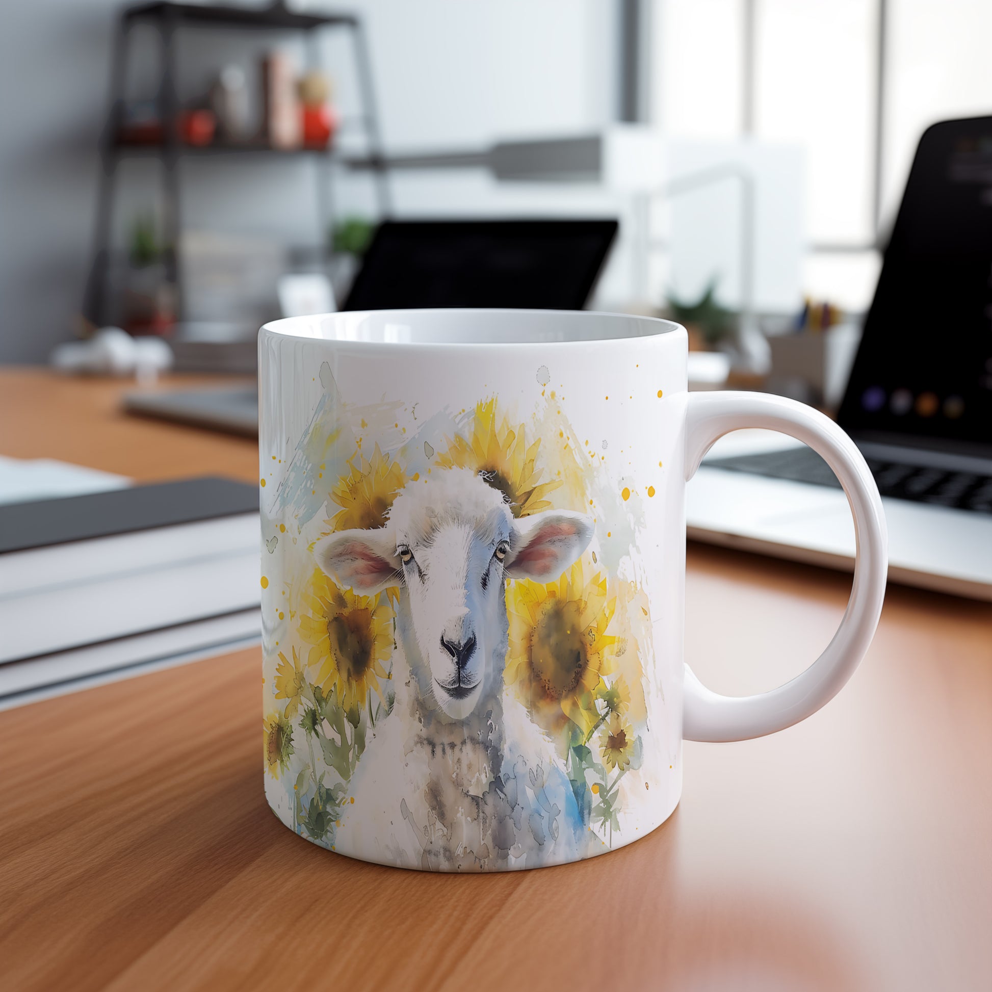 Hrnek s motivem ovečky mezi slunečnicemi v akvarelovém stylu. Tento hrnek je ideální pro milovníky zvířat a přírody, skvělý tip na dárek pro vaše blízké. Materiál: keramika. Objem: 330 ml. Vhodné do myčky i mikrovlnky. Užívejte si svůj oblíbený nápoj s tímto jedinečným designem.