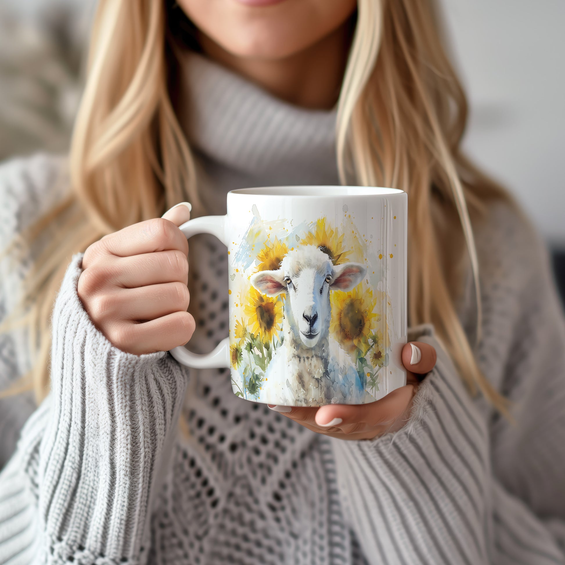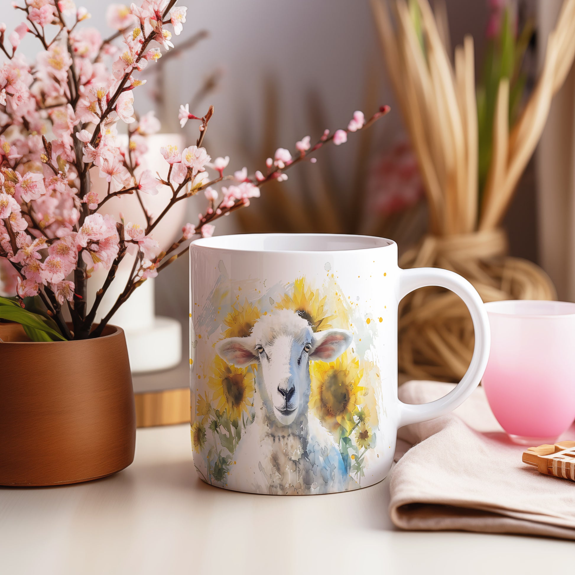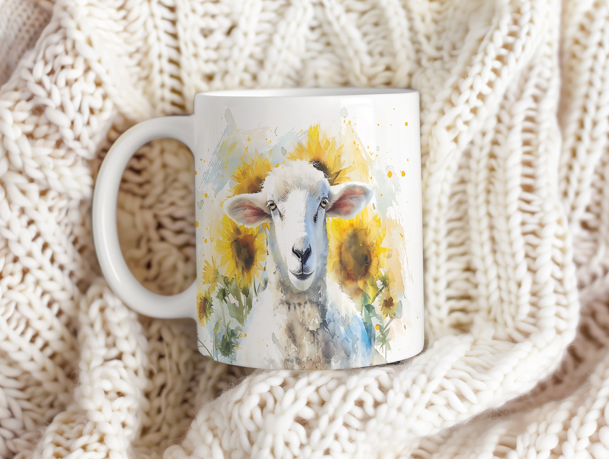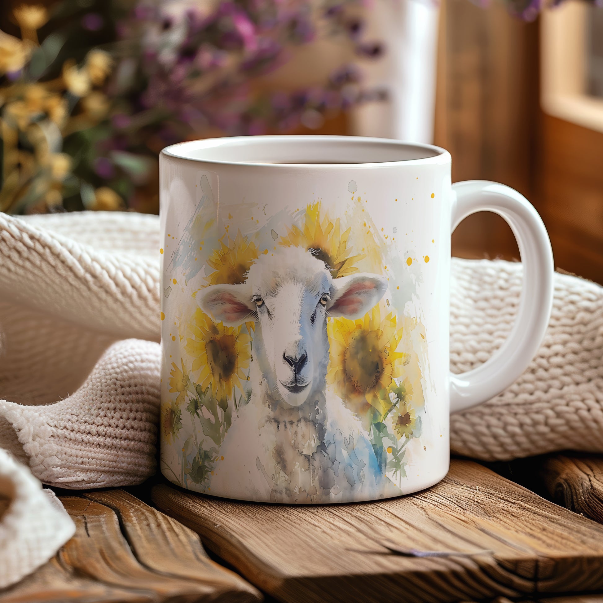 Hrnek s motivem ovečky mezi slunečnicemi v akvarelovém stylu. Tento hrnek je ideální pro milovníky zvířat a přírody, skvělý tip na dárek pro vaše blízké. Materiál: keramika. Objem: 330 ml. Vhodné do myčky i mikrovlnky. Užívejte si svůj oblíbený nápoj s tímto jedinečným designem.